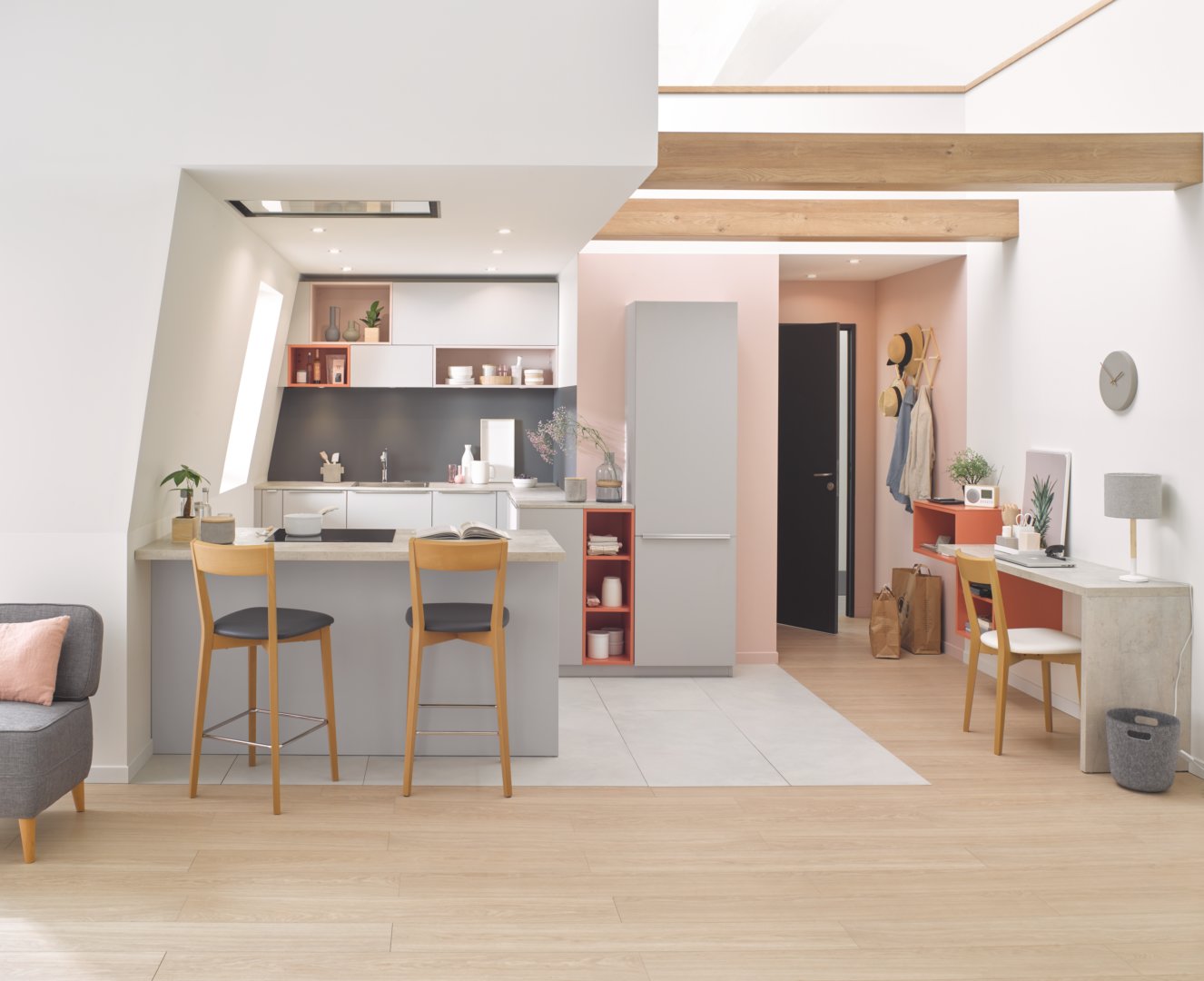 Si vous vous orientez plutôt vers une solution bichrome, introduisez votre deuxième couleur par petites touches : dans les niches par exemple, ou au niveau du plan de travail et de la crédence, tout en privilégiant des façades unies. Pensez à harmoniser les couleurs sur l’ensemble des éléments qui composent votre cuisine : chaises et tabourets autour de l’îlot ou du coin repas, luminaires… Tout doit être dans le même ton ou jouer avec les rappels de couleur.