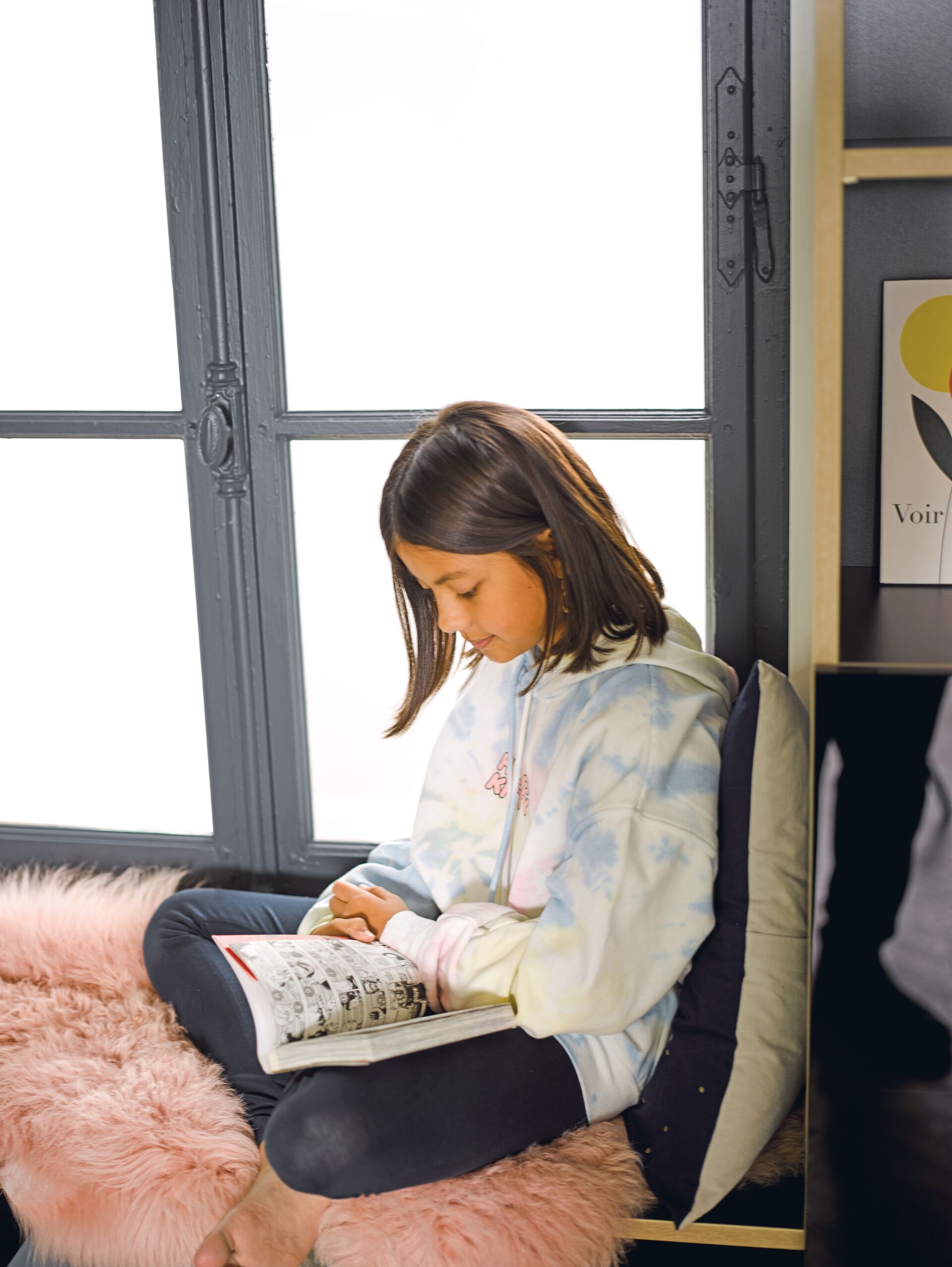 Privilégiez les carrelages, le parquet flottant ou encore les revêtements en vinyle qui se lessivent en un clin d'œil. Attention aux tapis à longs poils et à la moquette, qui n'apprécieront pas vraiment la pâte à modeler écrabouillée… ! Vos artistes en herbe apprécieront de retrouver dans le salon un bureau à leur taille : privilégiez des meubles à leur hauteur ! Ancien bureau d'écolier chiné ou meuble bas et épuré, à vous d'adapter le style à votre décoration. Si la place le permet, installez une banquette, ou tout simplement de gros coussins de sol autour d'une bibliothèque à roulettes ou d'étagères placées à hauteur des petites mains : une zone lecture qu'ils n'auront pas envie de quitter !