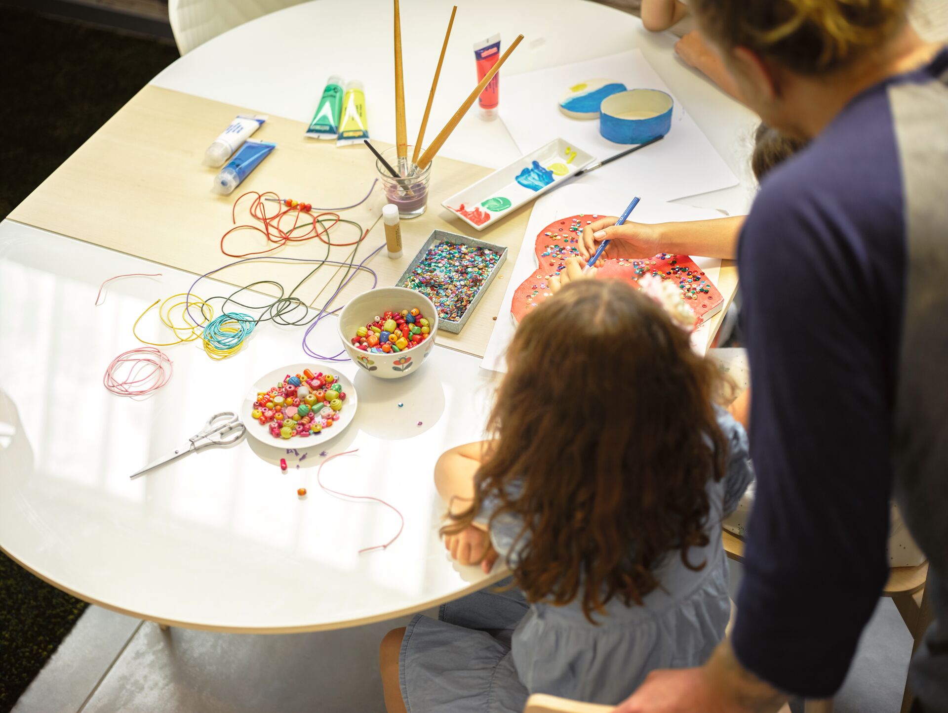 • Le coin créatif : avec le matériel pour les activités manuelles et, pourquoi pas, un tableau ou encore un pan de mur peint « tableau noir » !