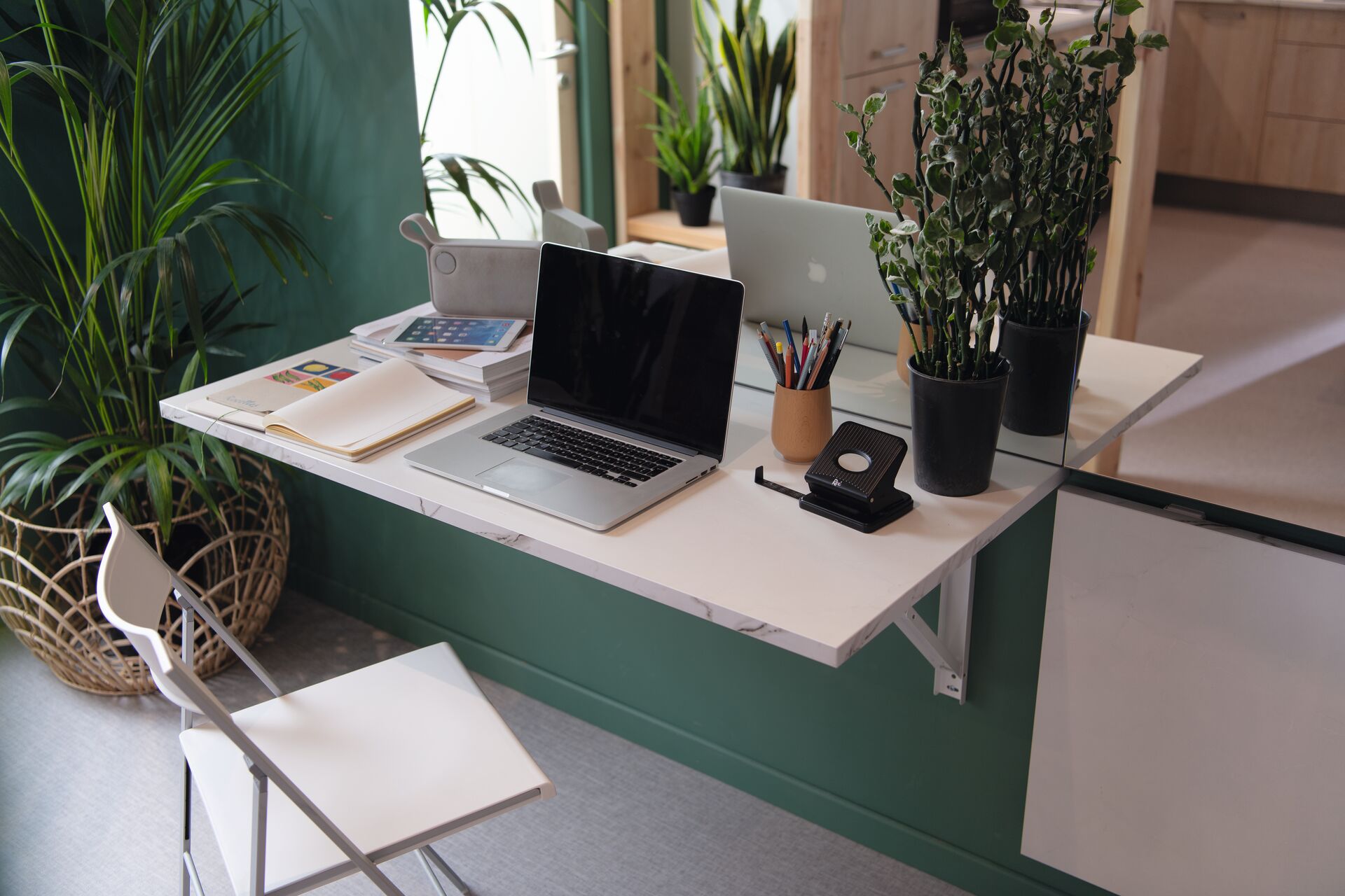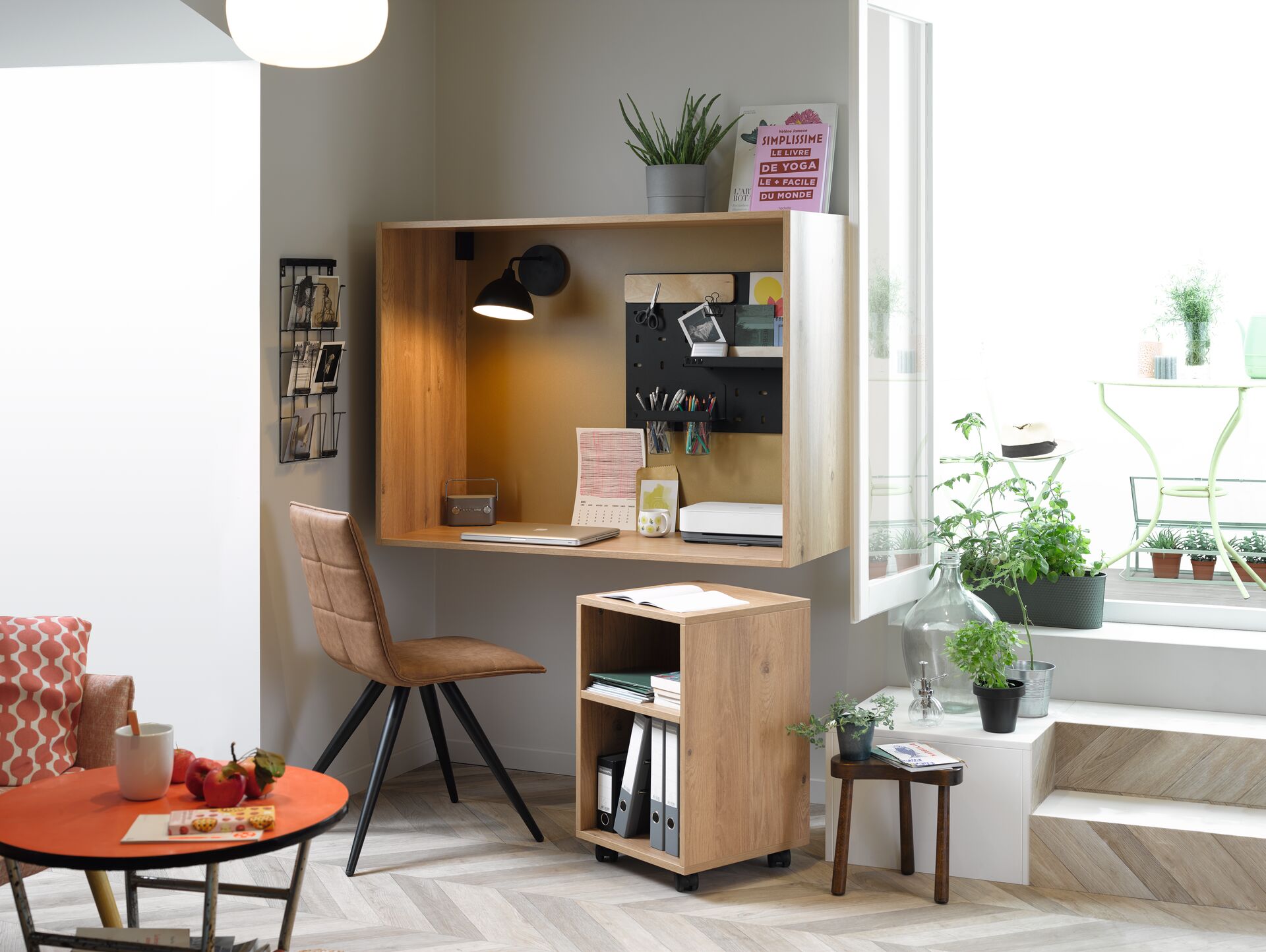 Solution de télétravail avec table rabattable, idéale pour les petits espaces !