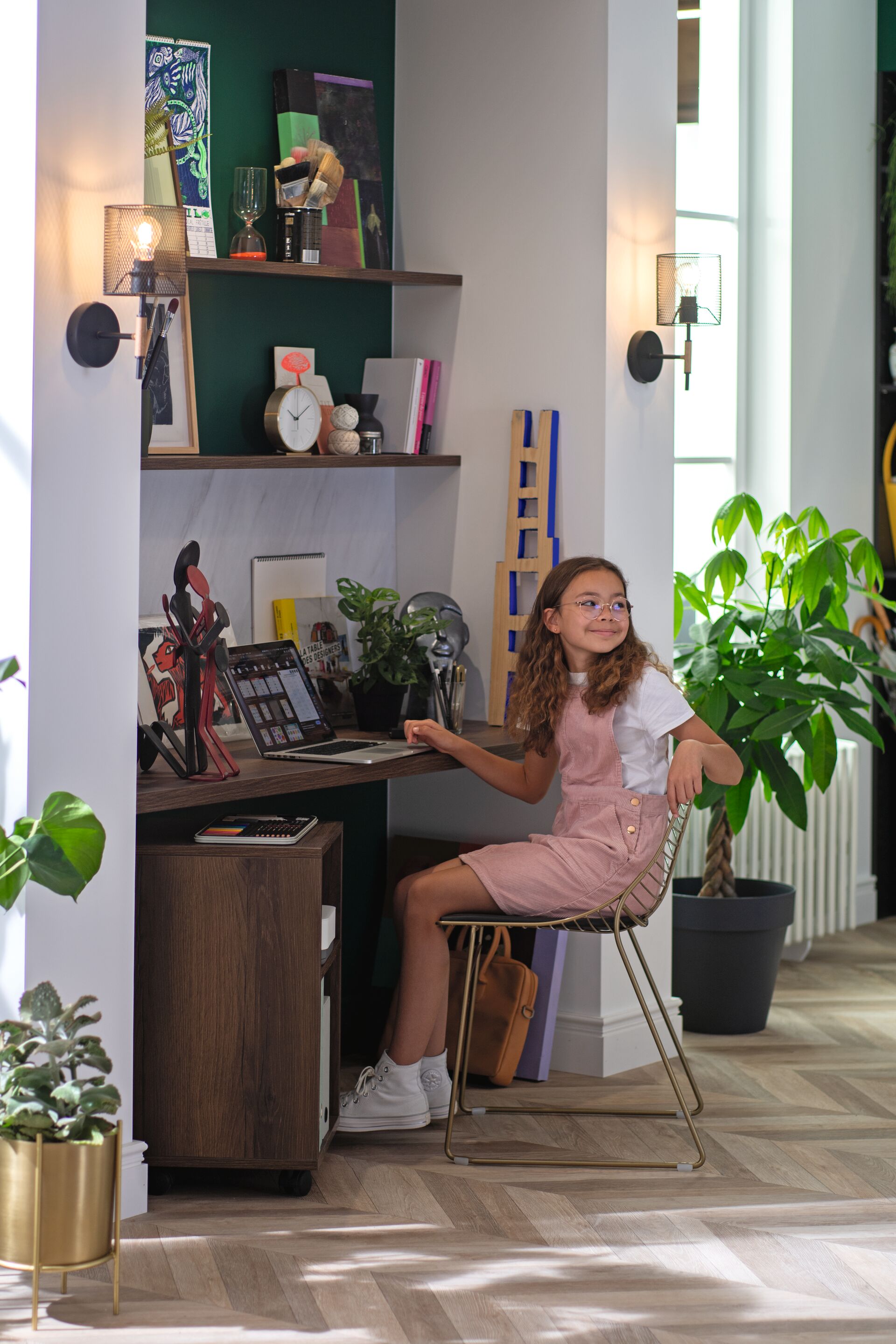 Concernant leur espace bureau, jouez avec les codes couleurs dans le but de rendre cet environnement inspirant et stimulant pour les devoirs. Utilisez par exemple une boîte à motifs bleus pour ranger les fournitures comme les stylos ou un panier vert DIY pour les crayons de couleur. Ces petites notes colorées ajouteront une touche ludique et personnalisée à leur espace de travail, ce qui les encouragera à se sentir à l'aise et créatifs pendant leurs activités.