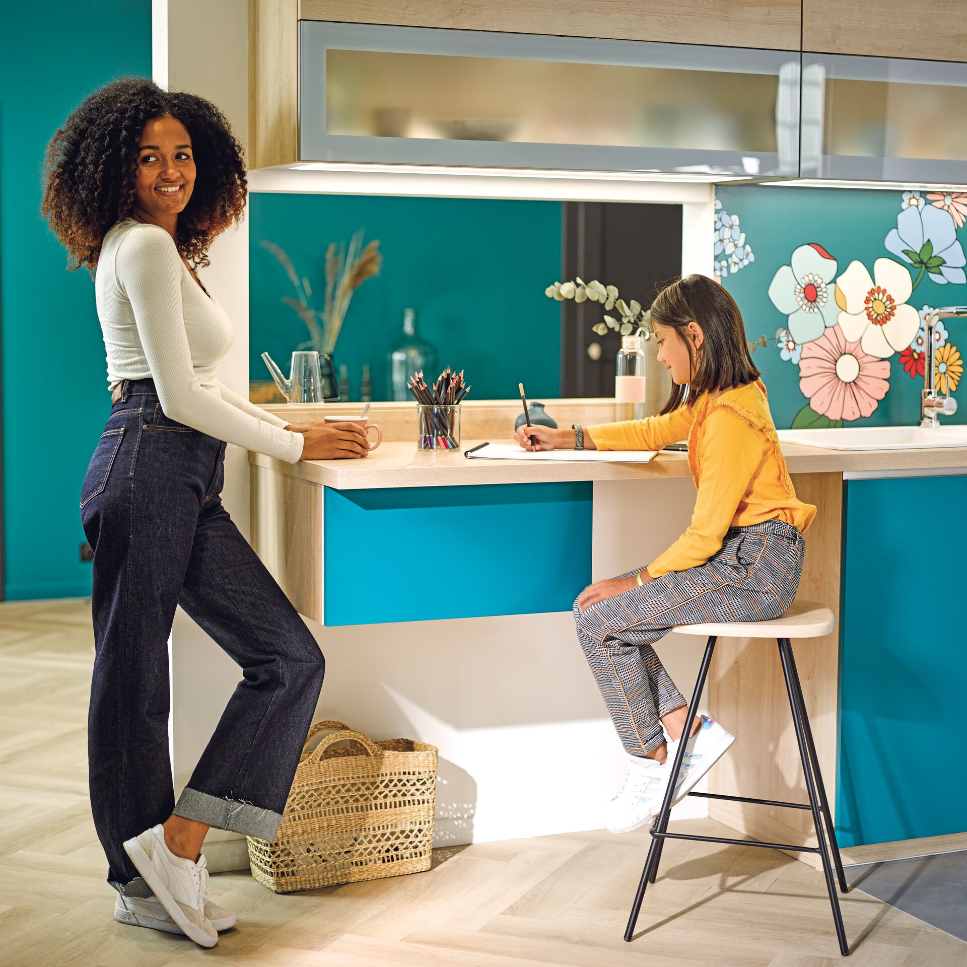 Les cuisines modernes flirtent parfois avec l’idée — astucieuse — d’intégrer un petit coin bureau malin et discret dans leur configuration… mais, à cet âge, une bonne table de cuisine peut aussi largement faire l’affaire pour leurs leçons.