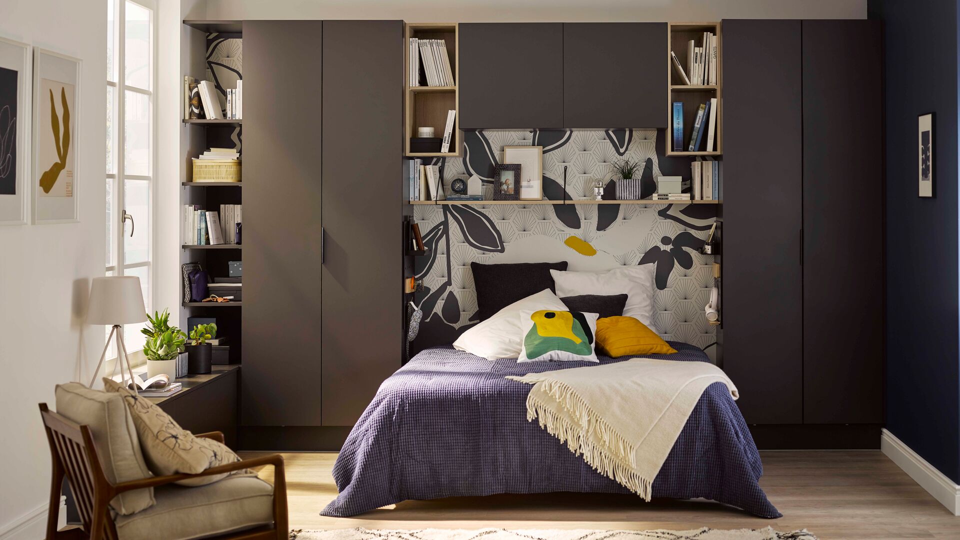 Mais la tête de lit à fonction de dressing est aussi tout indiquée dans une grande chambre. Elle vient par exemple souligner le caractère élégant et toujours un peu luxueux d’une suite parentale, en particulier lorsque les modules sont disposés de manière symétrique de part et d’autre du lit. Placer le dressing au niveau de la tête de lit va alors plus loin que la déco en contribuant à une véritable mise en scène de la chambre. Les placards Ombre arborent une teinte foncée idéale pour une ambiance moderne feutrée où le lit est mis en valeur comme l’élément fort de la pièce. Si vous cherchez comment y ajouter une note de surprise, vous pouvez compter sur les papiers peints PIMP pour habiller l’espace tête de lit au milieu des meubles pour vous fournir des motifs et coloris originaux.