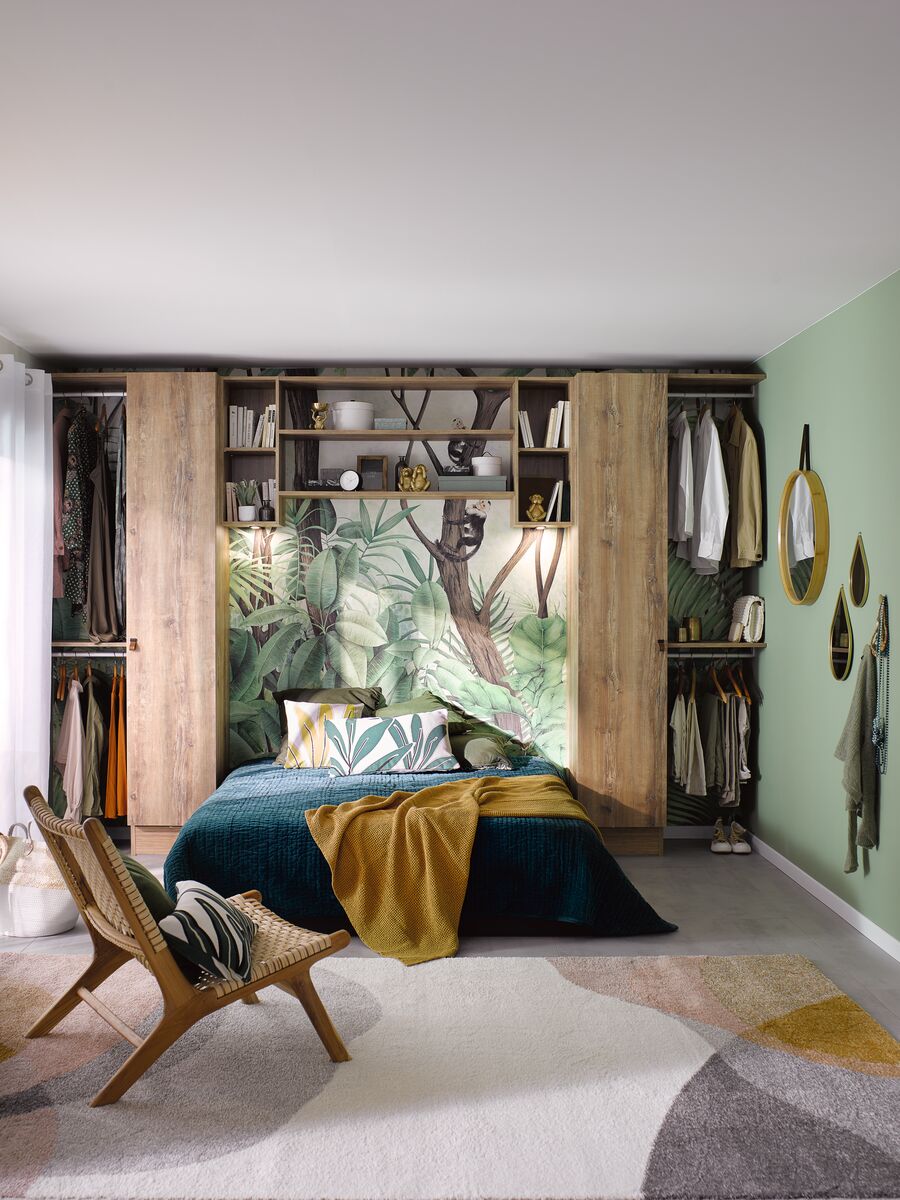 Pour que votre chambre soit une pièce apaisante où il est facile de s’endormir et où on aime se réveiller en douceur, misez sur les coloris mats et chaleureux en association avec le bois comme le propose le dressing Hipster Wood. Vous faites alors entrer la nature dans votre chambre et pourrez facilement compléter la déco avec des matières naturelles : abat-jour en rotin, miroir en bois, tapis en coton ou en sisal... La niche que crée le dressing au niveau de la tête du lit renforce ce sentiment de nid douillet, auquel vous pourrez apporter la touche finale en recouvrant le lit d’un plaid moelleux.
