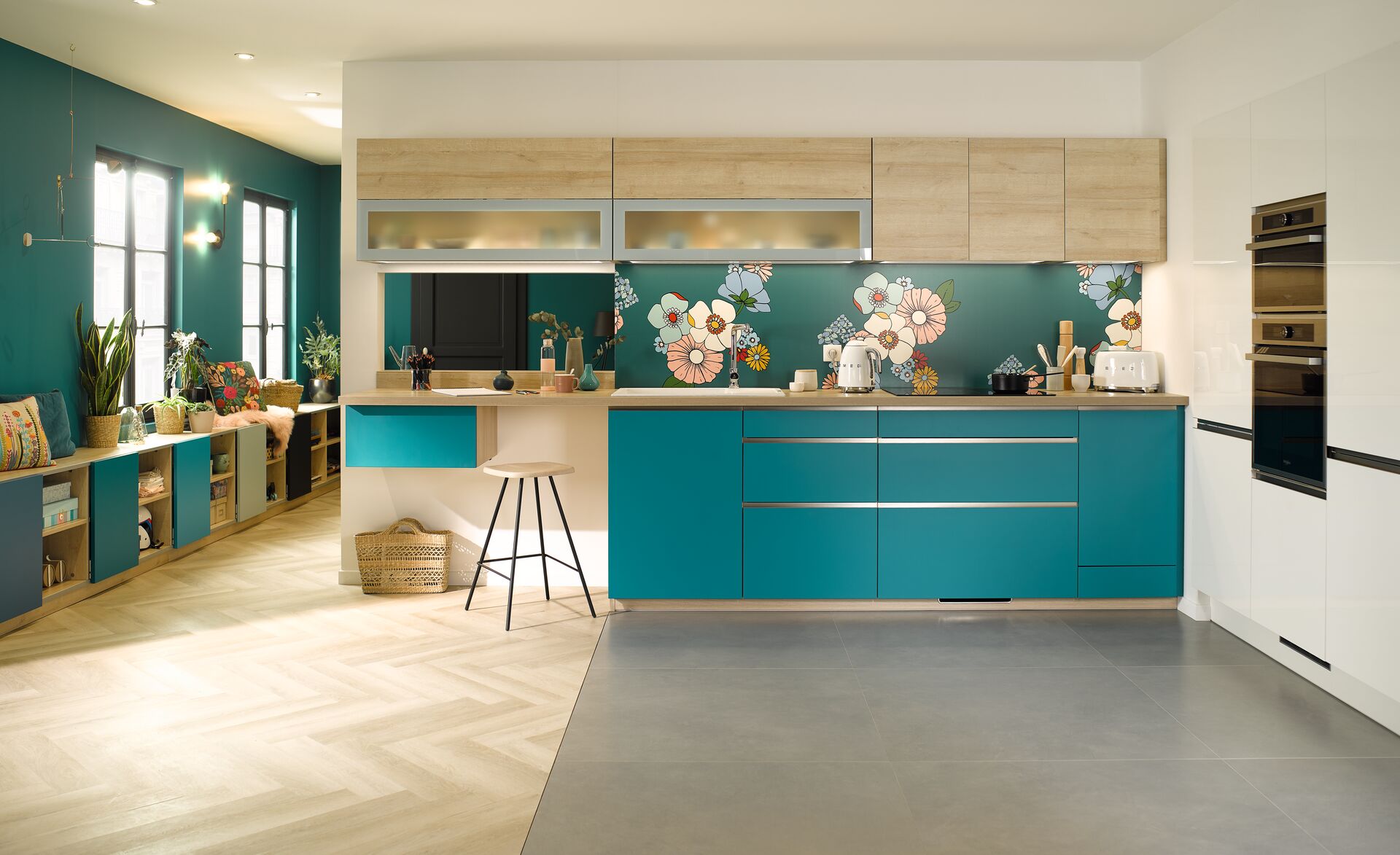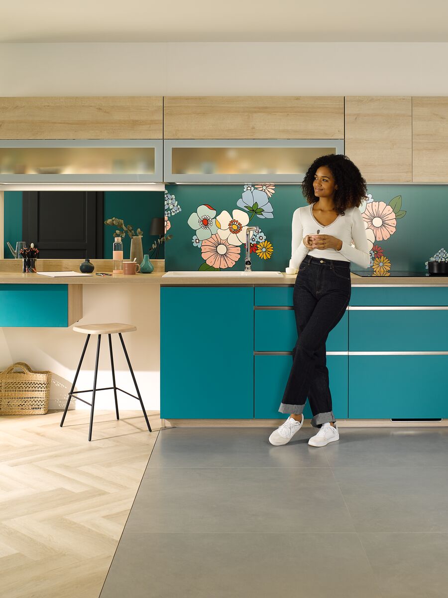 Si vous rêvez de faire de votre cuisine une pièce pleine d’énergie et de bonne humeur, misez sans hésiter sur le coloris laqué green oasis de Cuisinella ! Ses accents turquoise créent une ambiance exotique dans votre cuisine et se prêtent particulièrement bien à la mise en œuvre d’une décoration vintage. C’est le moment de sortir votre petit électroménager aux courbes rétro et la décoration punchy aux couleurs vives ! Avec la crédence Flower, c’est l’accord vintage parfait.