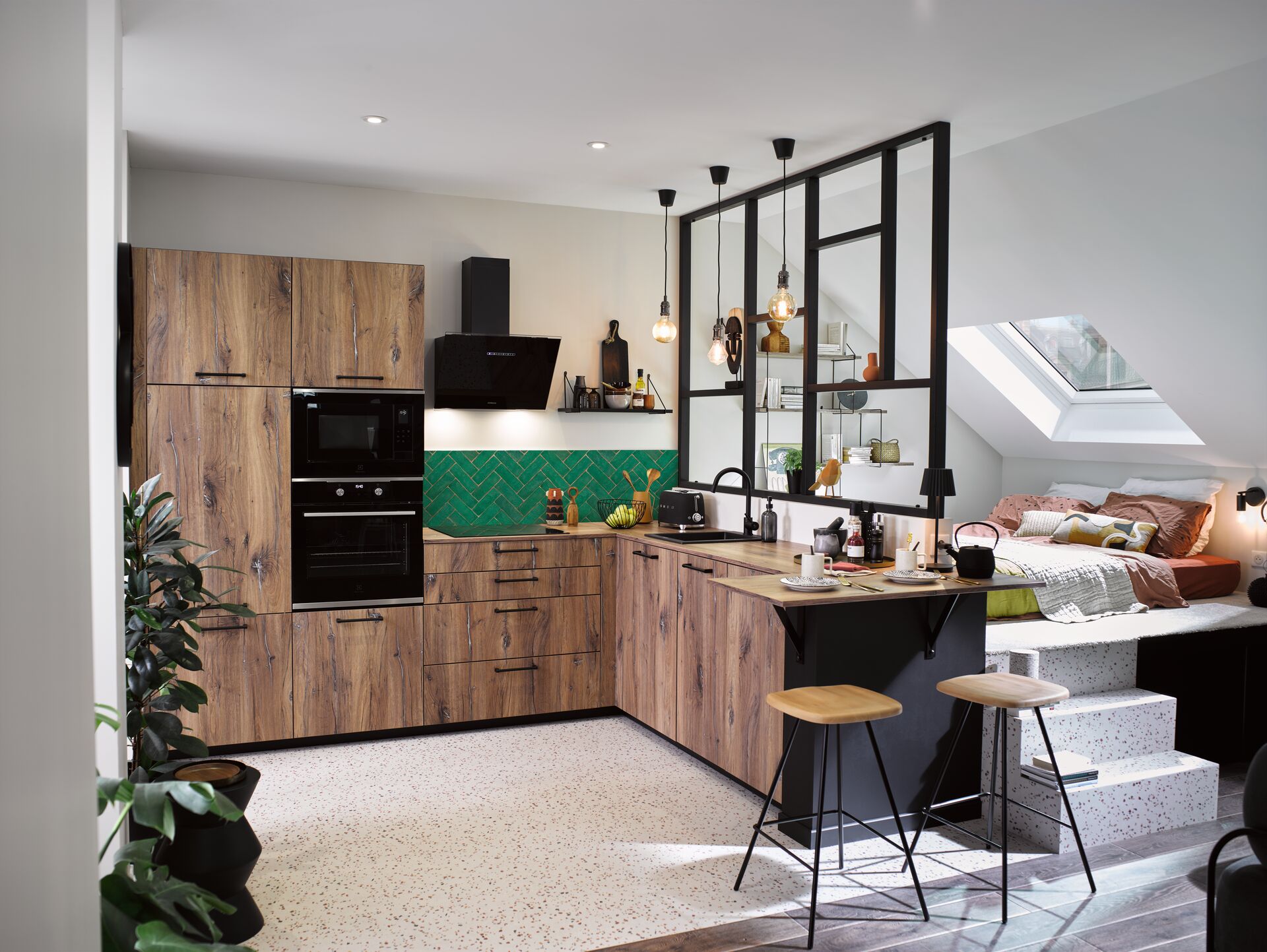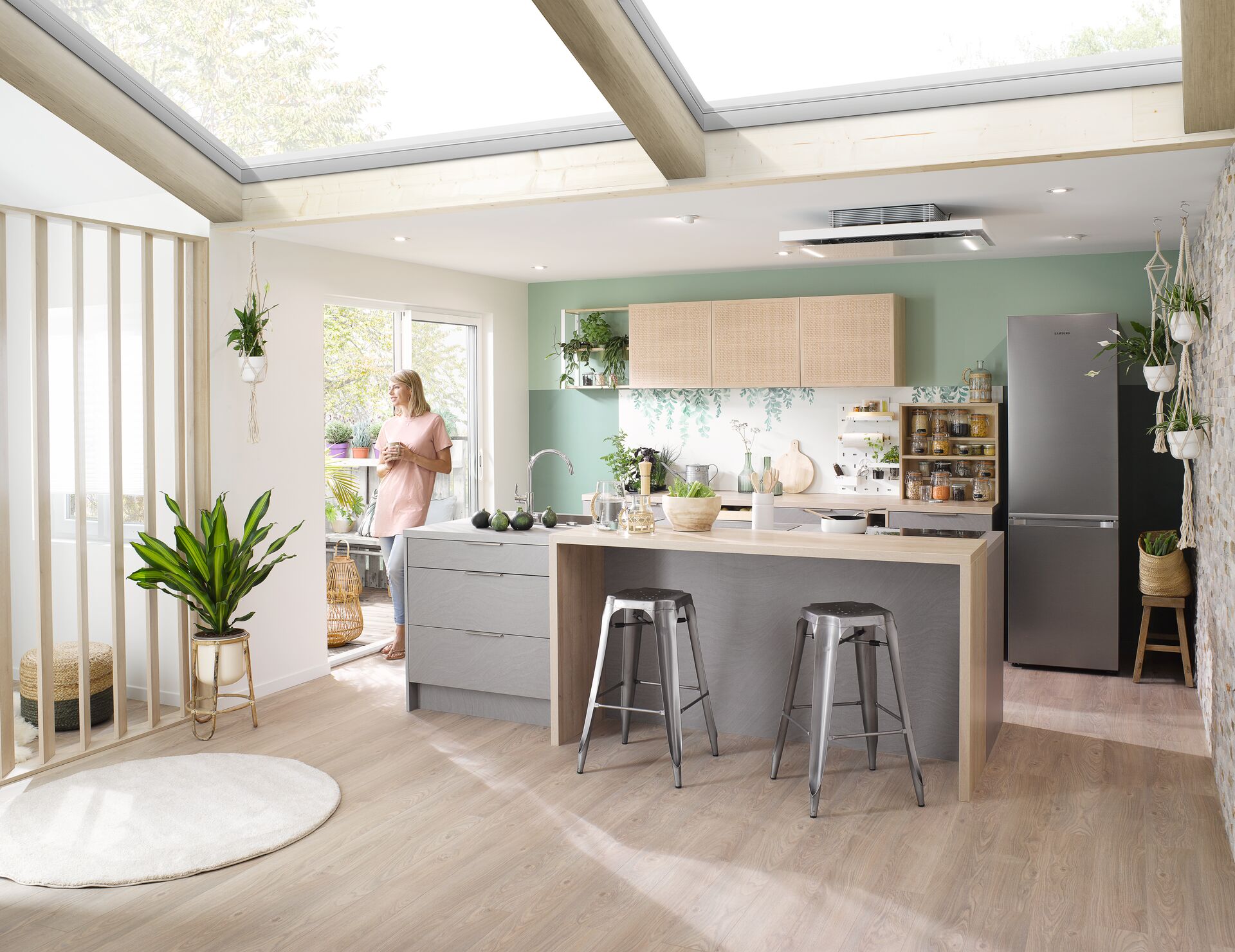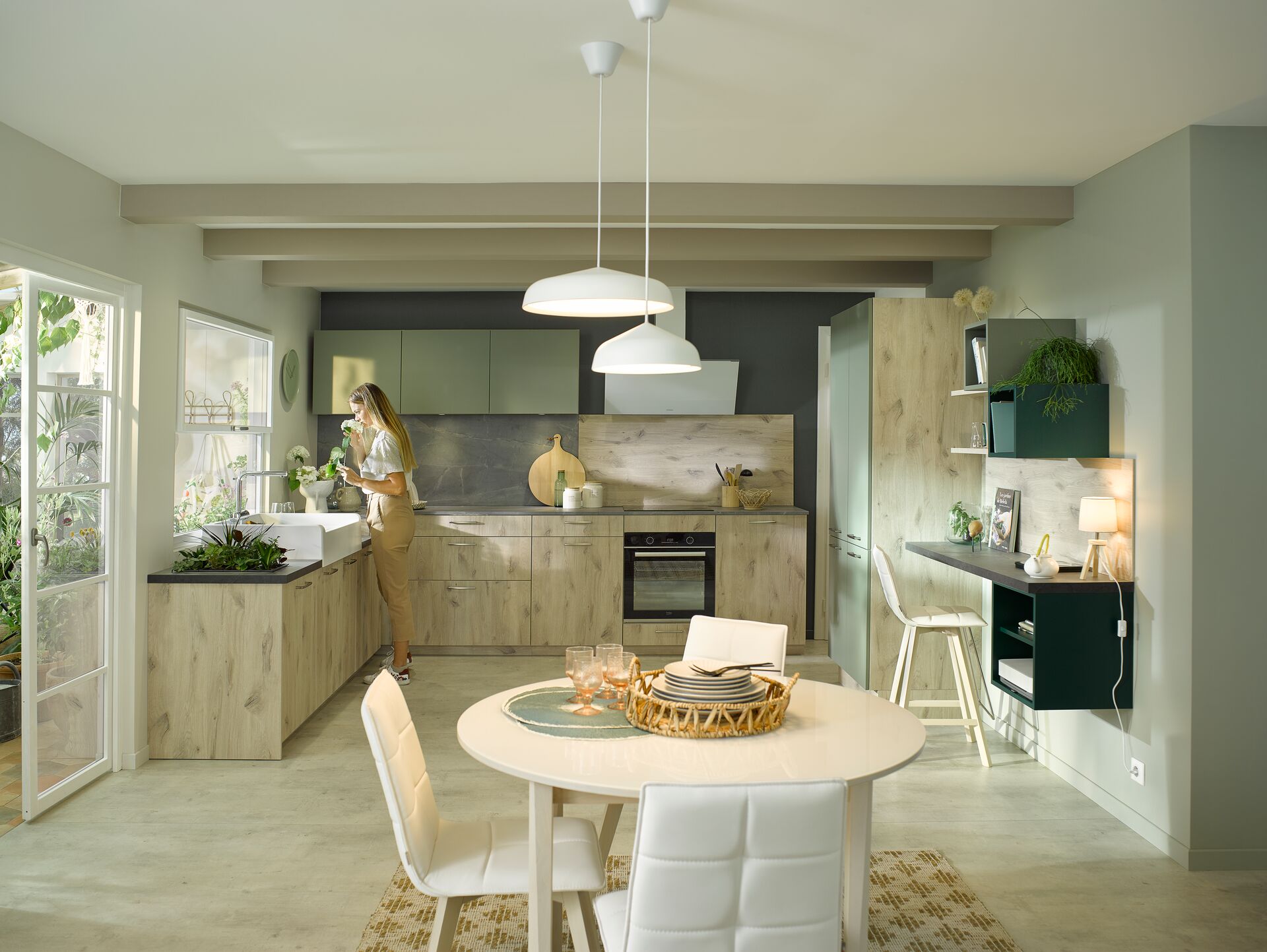 Teinte naturelle, le vert est la couleur idéale à marier avec le bois. Une combinaison qu’offre notamment le meuble garde-manger dans la cuisine (RE)SOURCE Viking Oak et COLOR Sauge. Façades vertes et plan de travail bois, mur vert et meubles bois, tout est possible ! Des nuances sombres de vert comme de bois orienteront votre cuisine vers un design sobre et élégant, tandis que des nuances plus claires cultiveront un style printanier idéal dans une cuisine qui cherche à évoquer une maison de campagne où règnent la convivialité et la proximité avec la nature.