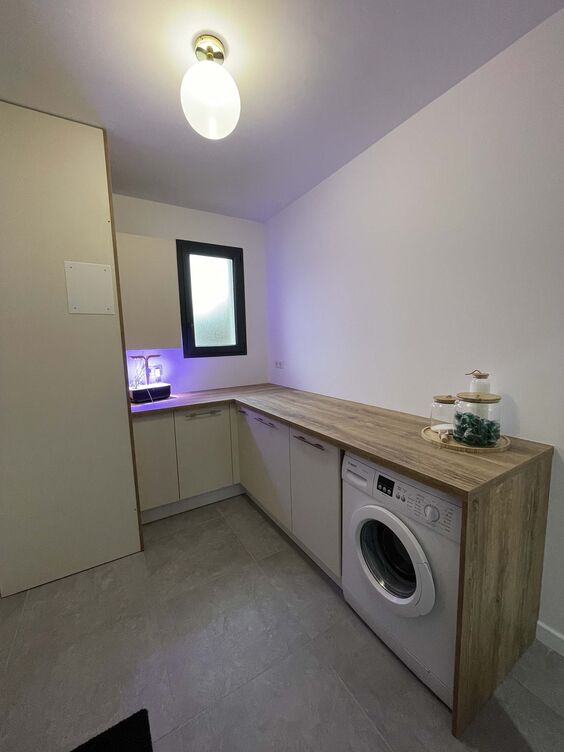 Chez Marie, sa buanderie a été transformée en un espace parfaitement organisé grâce à des meubles en finition Pannacotta mat. Optimisez votre espace buanderie avec des solutions de rangement adaptées à vos besoins quotidiens.