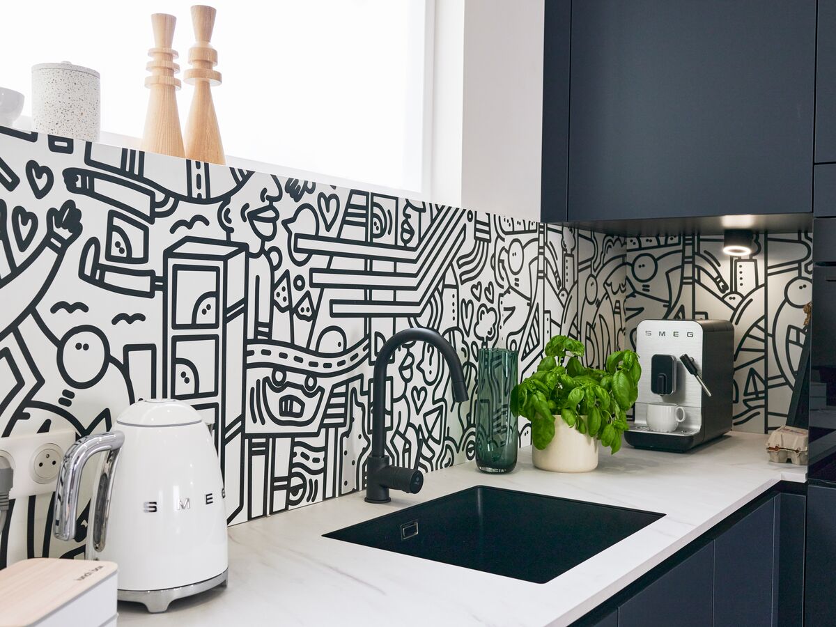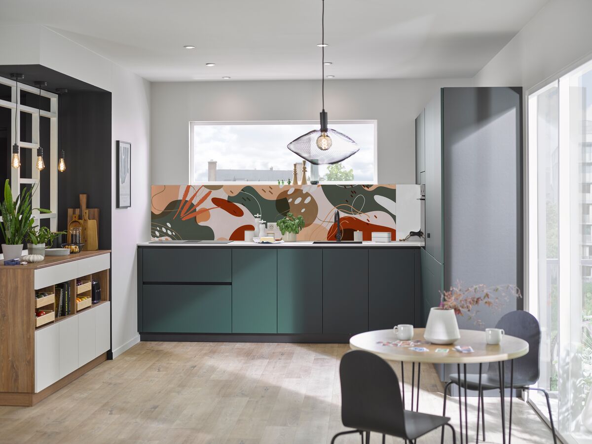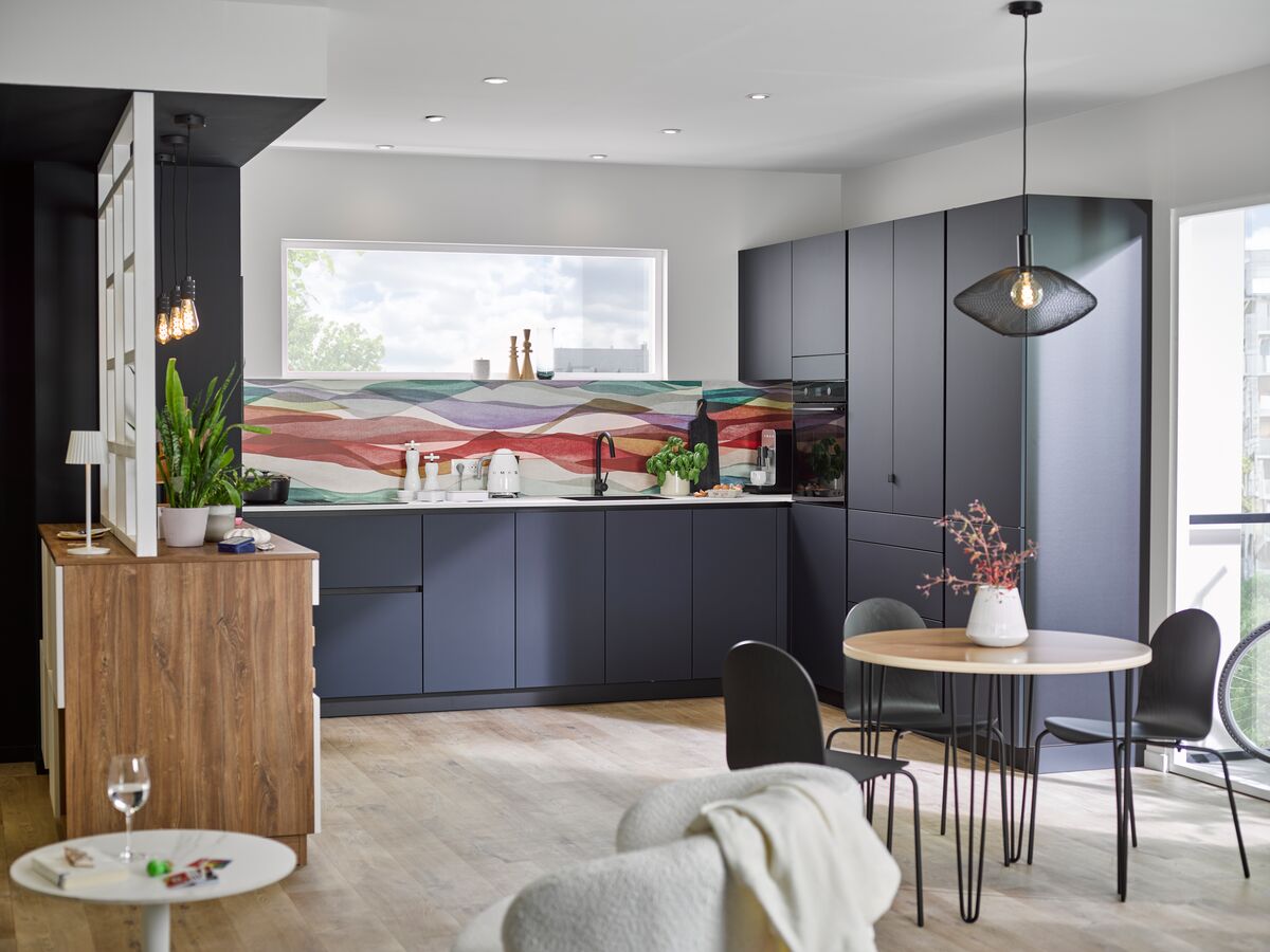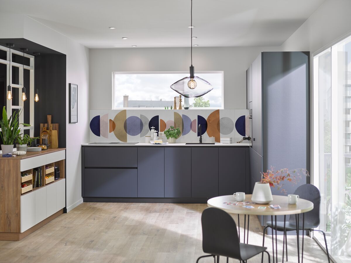 L'ingéniosité se cache dans chaque détail : les façades sans poignée intègrent un système de gorge linéaire qui facilite l'ouverture tout en préservant une esthétique épurée. La crédence exclusive, développée en partenariat avec OuestleD, apporte une touche artistique unique à votre cuisine blanche et noire. Disponible également en version sombre, elle s'harmonise parfaitement avec les façades pour une personnalisation totale.