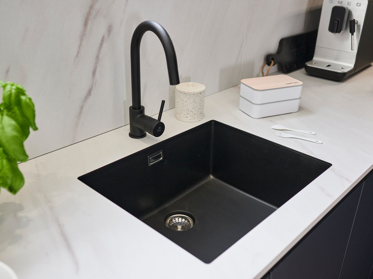 L'ergonomie est au cœur de cette conception avec des solutions pratiques comme la cuve sous plan qui s'intègre discrètement sous le plan de travail, offrant une surface de travail plus importante et un nettoyage facilité. Dans l'angle, une niche dédiée au petit électroménager permet un accès rapide tout en maintenant un espace ordonné.
