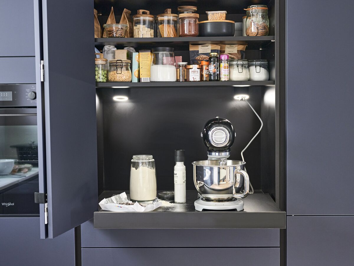 Les équipements innovants s'enchaînent : meuble petit électro intelligent, porte pliante pour un accès optimal, tablette coulissante pour plus de flexibilité, et prises éclairantes intégrées aux étagères. Chaque élément a été pensé pour optimiser l'espace et simplifier votre quotidien.