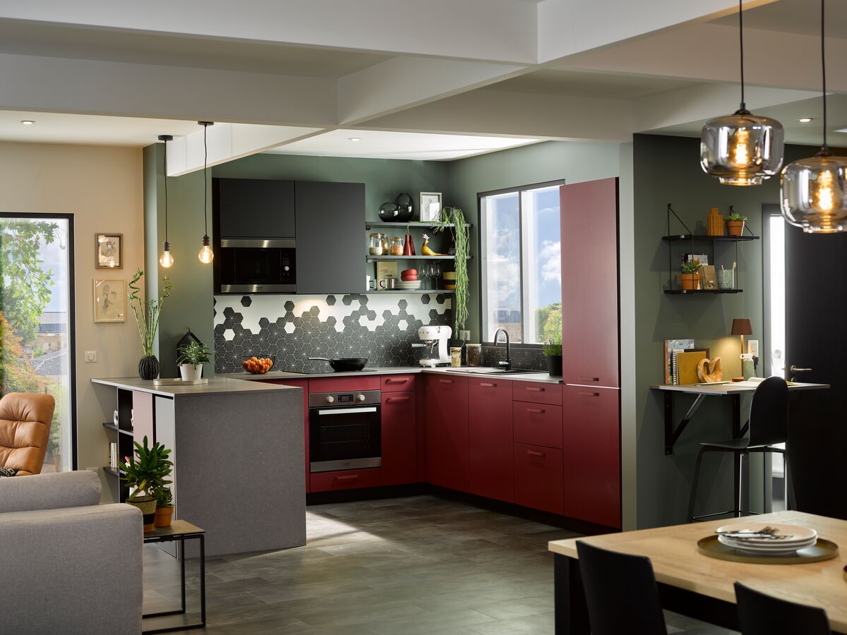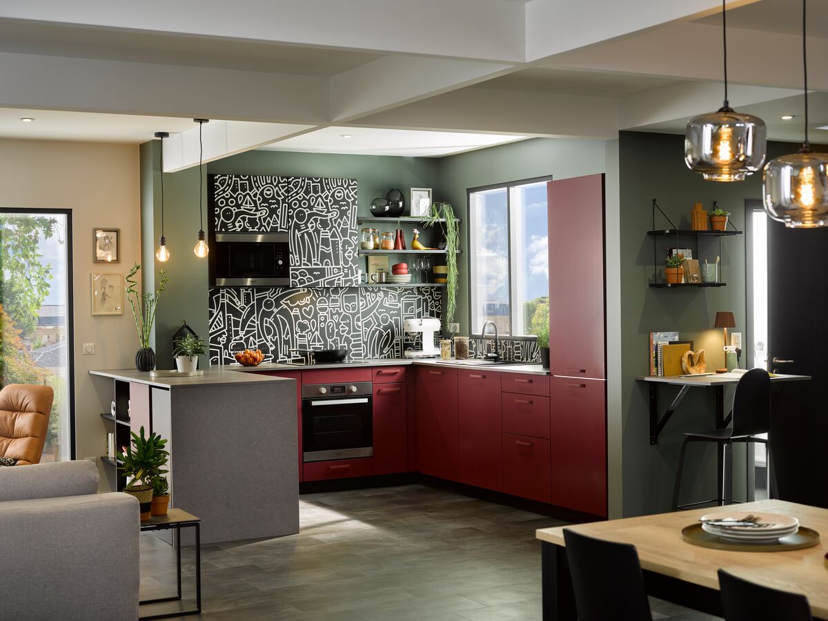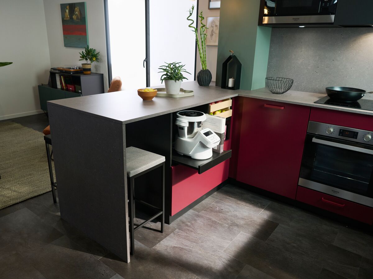 L'espace de cette cuisine ouverte a été pensé pour les créatifs qui aiment cuisiner sans contraintes. Le plan de travail contraste élégamment avec les façades rouges, tandis que la hotte, parfaitement intégrée aux meubles hauts, se fait discrète tout en maximisant le rangement. Pour vos robots et autres équipements, une tablette coulissante facilite leur utilisation quotidienne – fini le sport matinal pour sortir votre blender !