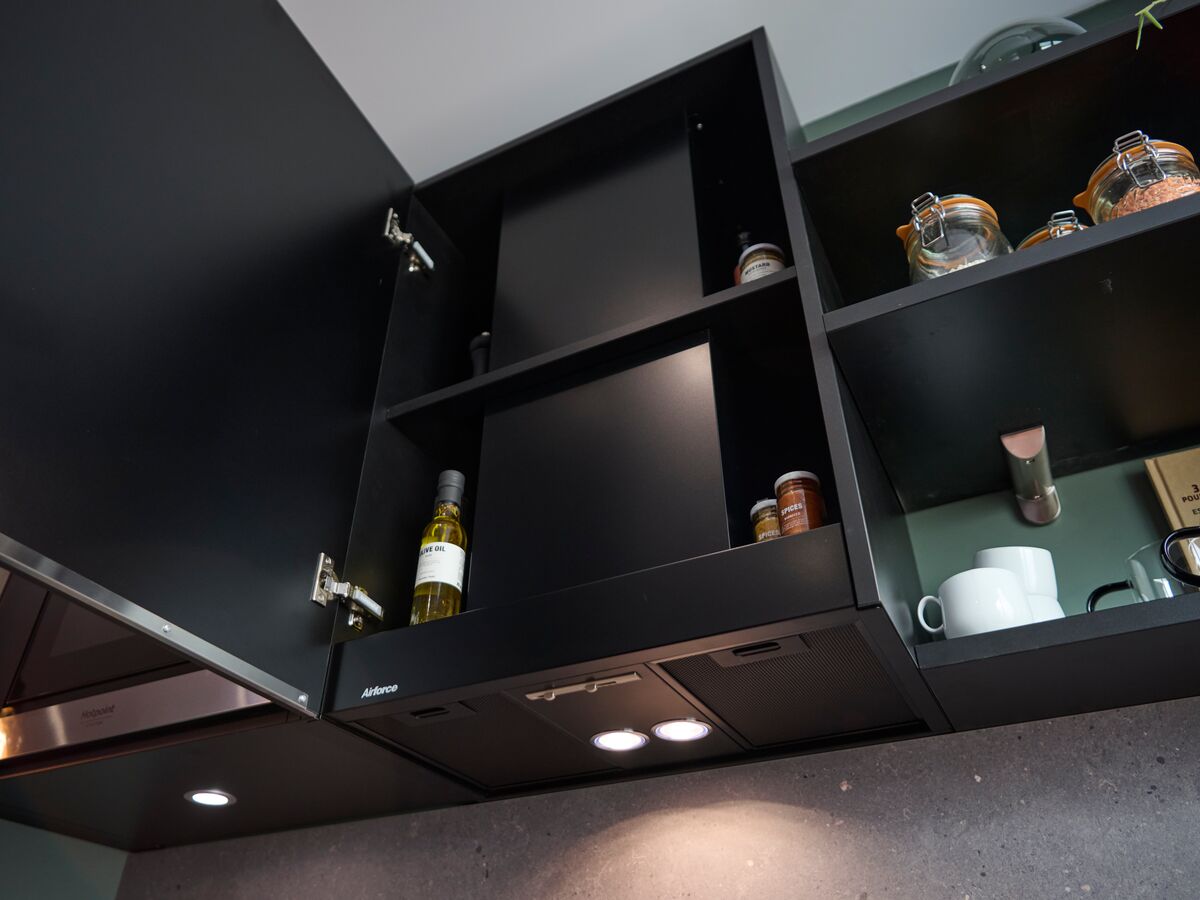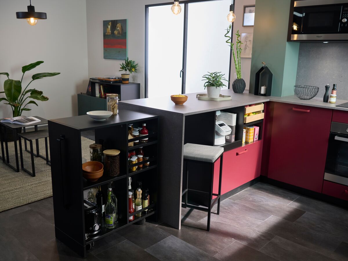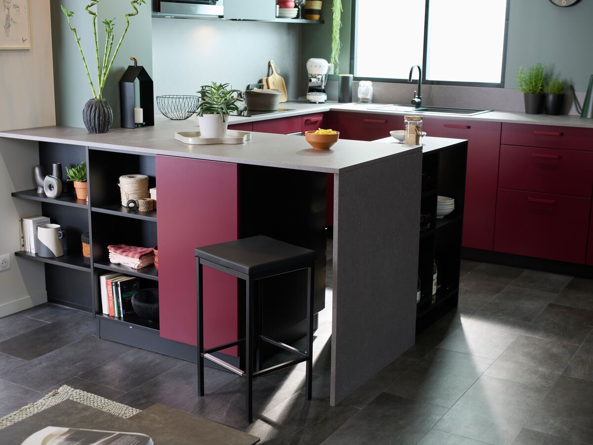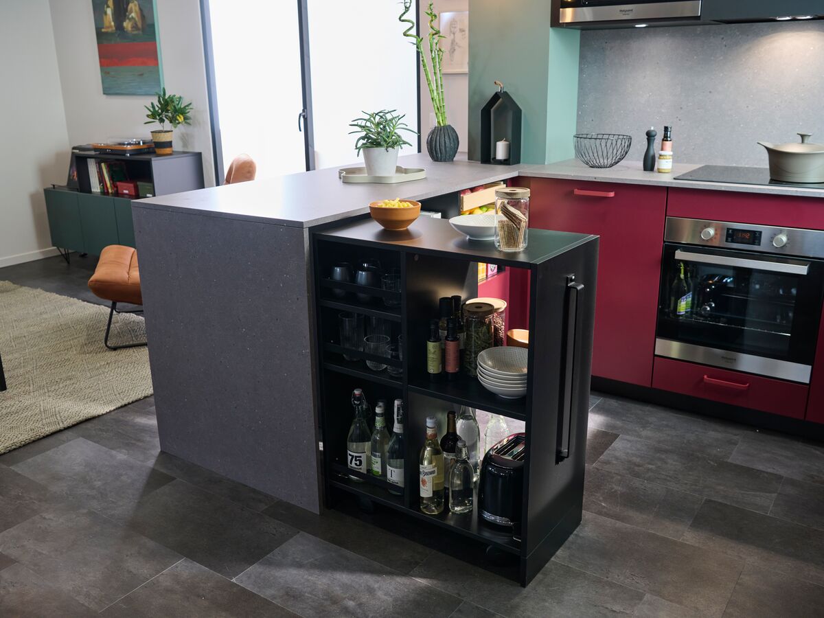 L'espace de cette cuisine ouverte a été pensé pour les créatifs qui aiment cuisiner sans contraintes. Le plan de travail contraste élégamment avec les façades rouges, tandis que la hotte, parfaitement intégrée aux meubles hauts, se fait discrète tout en maximisant le rangement. Pour vos robots et autres équipements, une tablette coulissante facilite leur utilisation quotidienne – fini le sport matinal pour sortir votre blender !