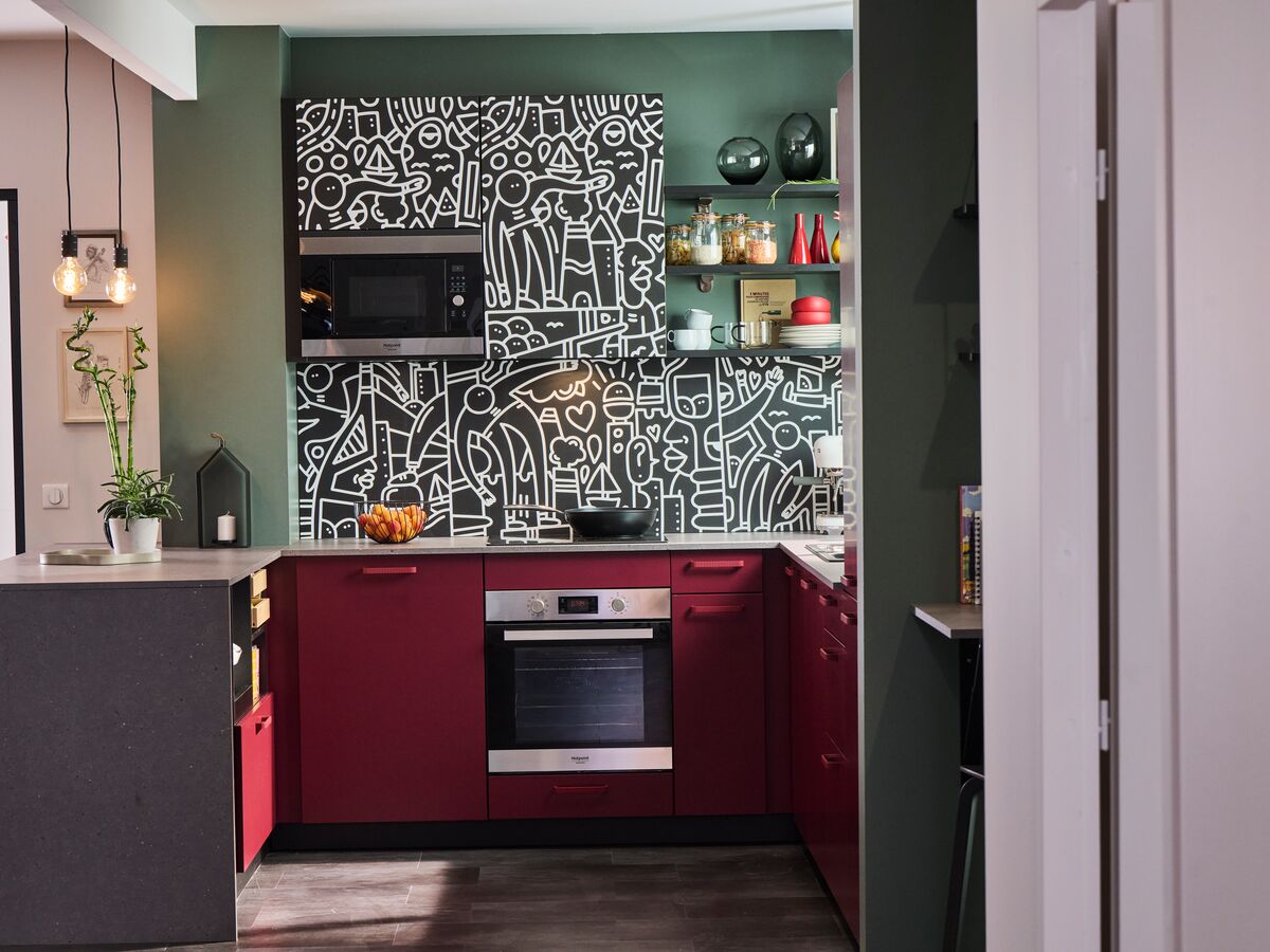 Chaque élément de cette cuisine noire et rouge a été pensé pour sublimer votre quotidien. Les poignées assorties aux façades préservent la pureté des lignes, tandis que les tiroirs et coulissants sont équipés d'un système de fermeture douce. La crédence, véritable œuvre d'art urbaine, apporte du caractère à l'ensemble tout en protégeant efficacement vos murs des projections.