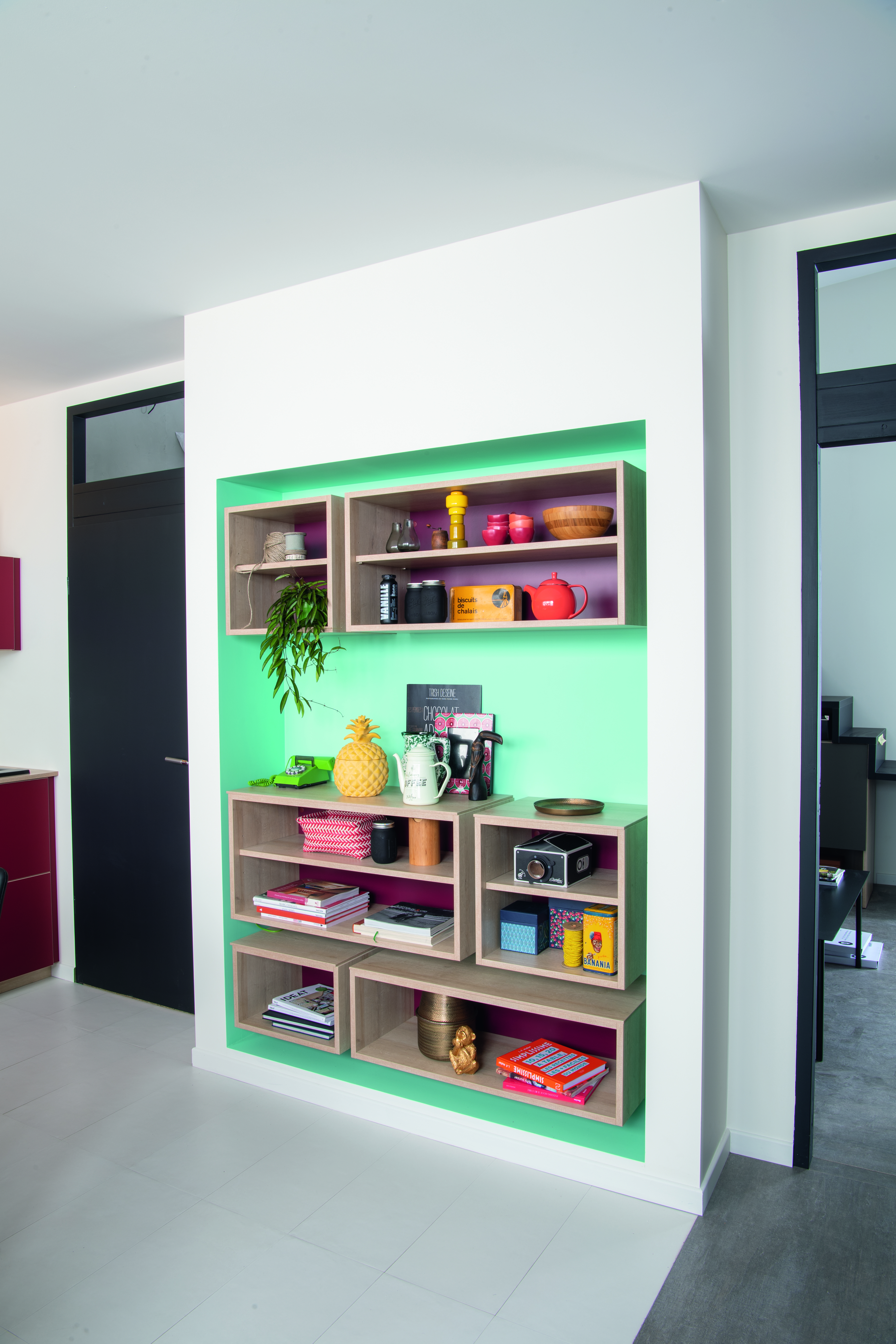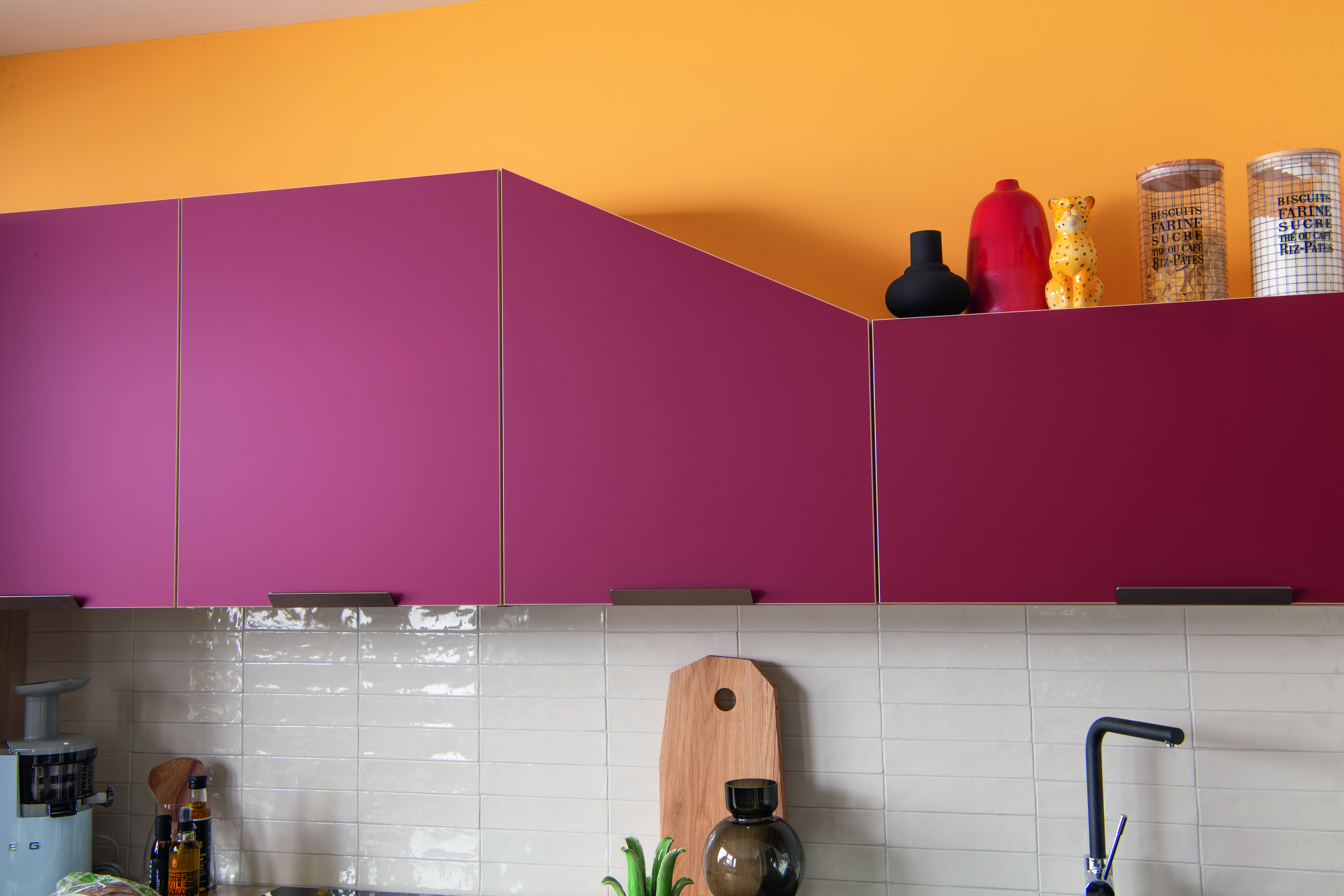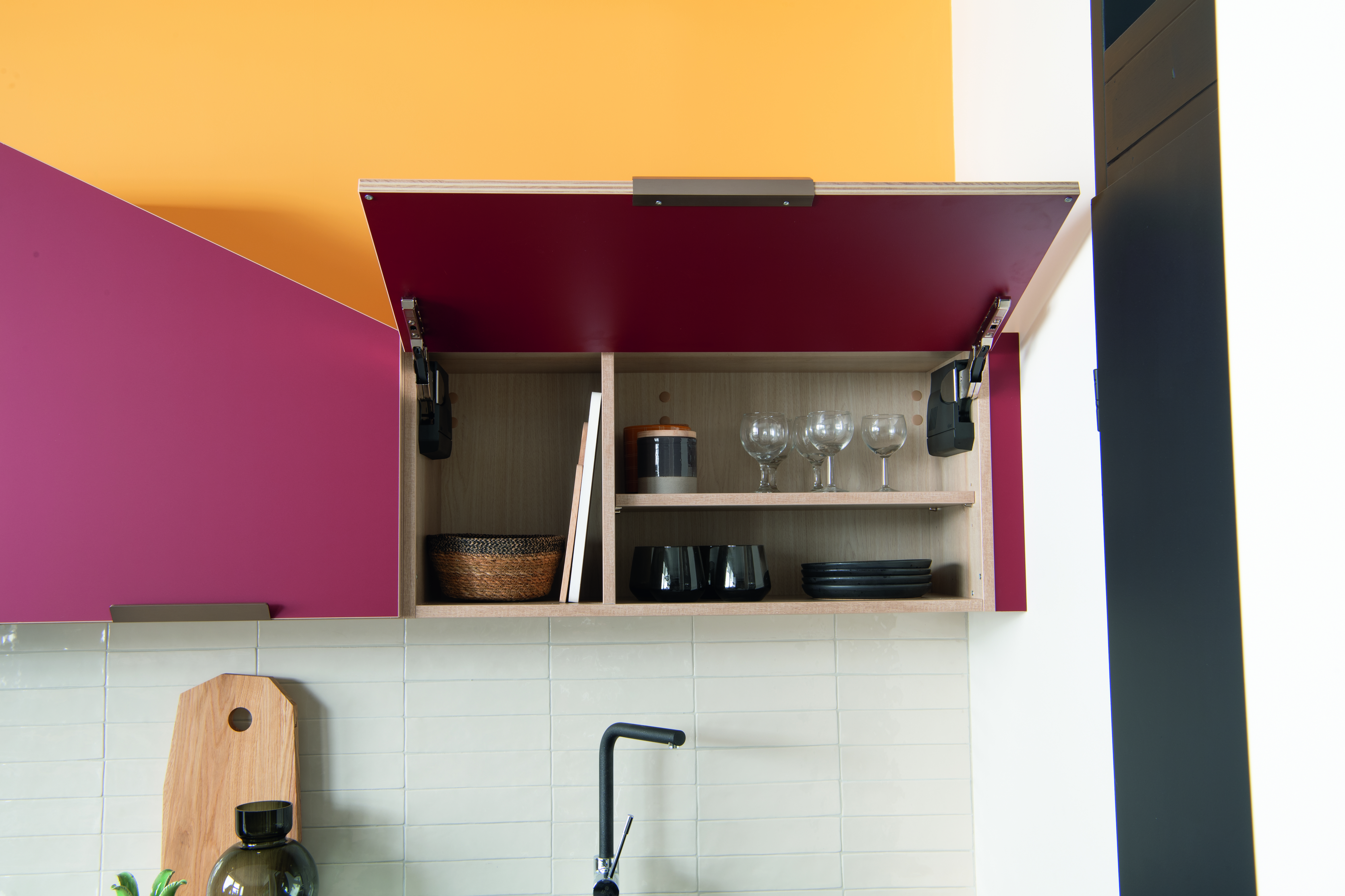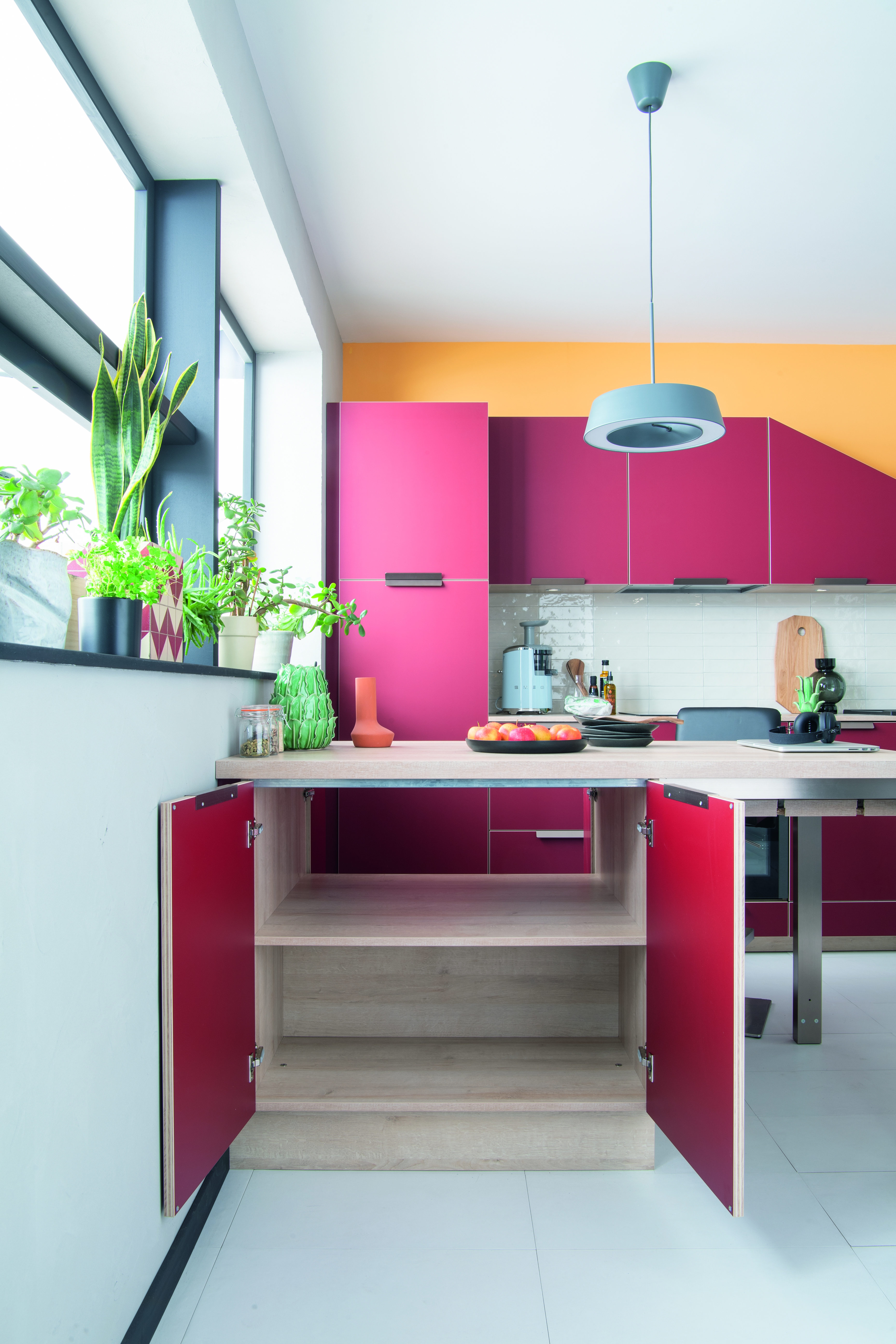 Une cuisine flashy qui a tout d’une grande. Les accents pop de la cuisine COLOR Carmen sont idéaux pour réveiller les petits espaces. Le rouge gourmand met les sens en éveil, tandis que les lignes géométriques apportent de la structure. Le bon mix pour une cuisine design et chaleureuse, qui ne manque pas de ressources, à l’image du plan de travail qui se déploie pour agrandir l’espace repas. Le plus : les placards hauts qui suivent une ligne déstructurée. On y dispose des vases et plantes pour en souligner le design et personnaliser sa cuisine à son image.