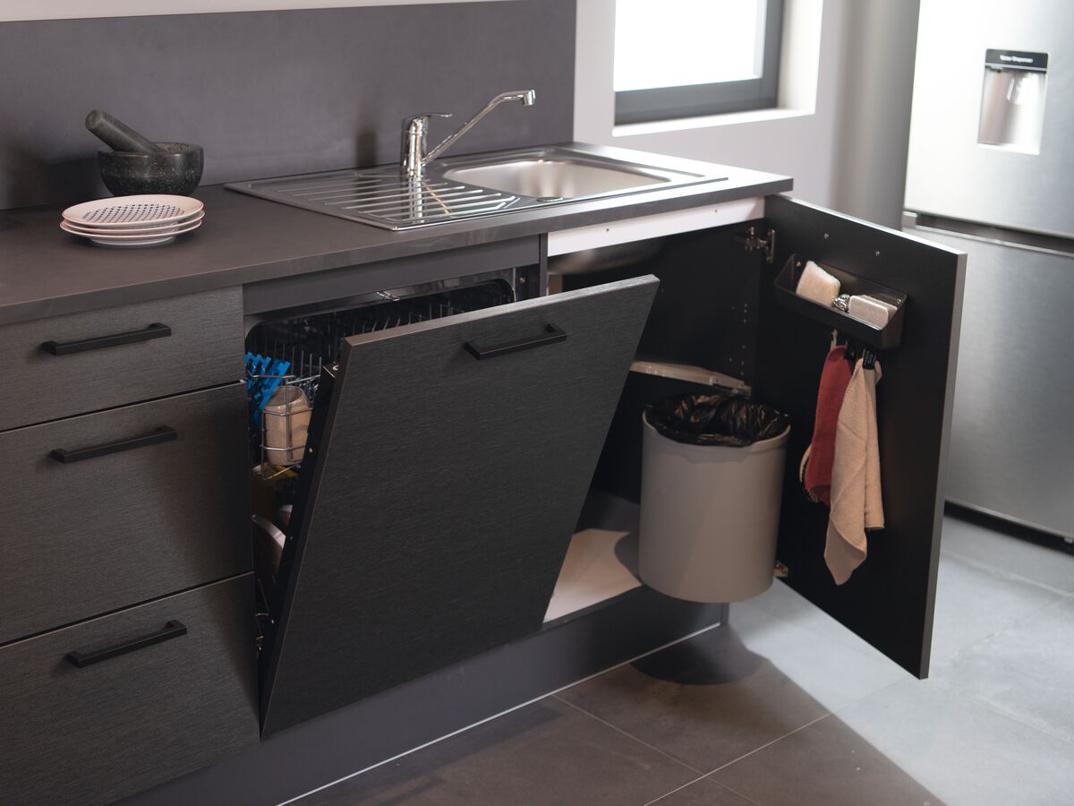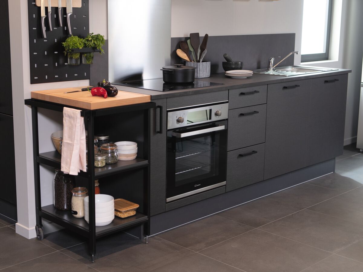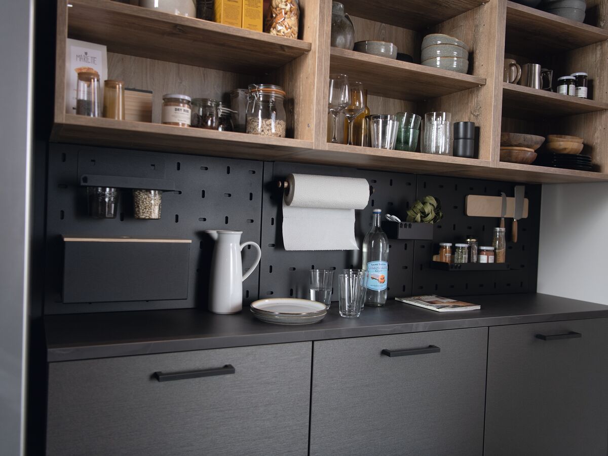 Très fonctionnelle, la cuisine Up Metal Brosse intègre de nombreux rangements ouverts, faciles à atteindre. Vos ustensiles sont bien visibles et deviennent des accessoires de déco à part entière ! Pensez à trier vos casseroles et vos assiettes par tailles ou par couleurs, pour ne pas rompre l’harmonie de cette belle cuisine industrielle.
