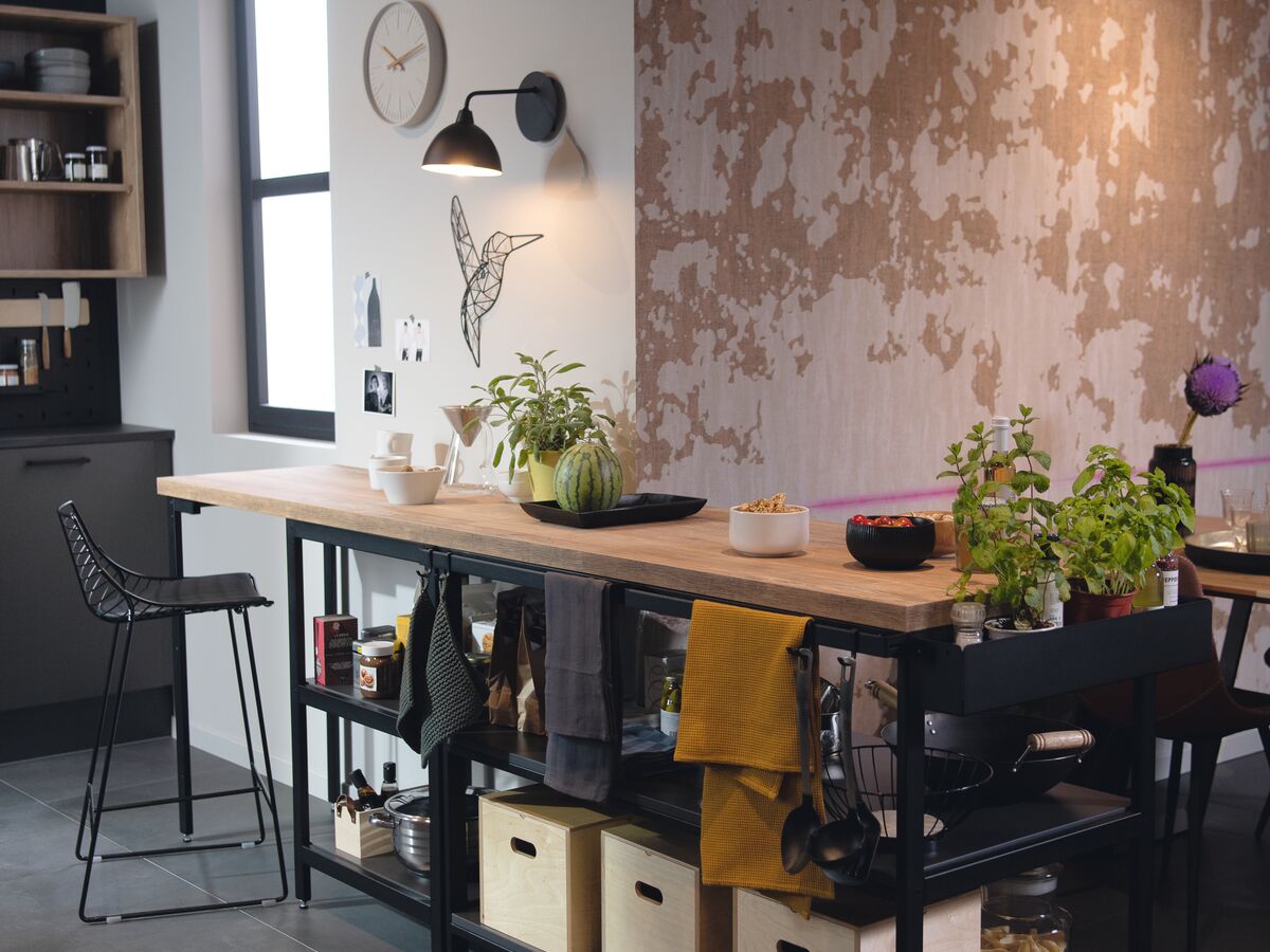 Distinguez-vous avec cette cuisine atypique style atelier indus. Située dans une ancienne maison de village entièrement rénovée, elle se pare d’un cachet certain et mêle accessoires vintage et mobilier moderne.