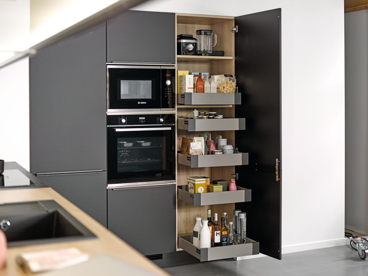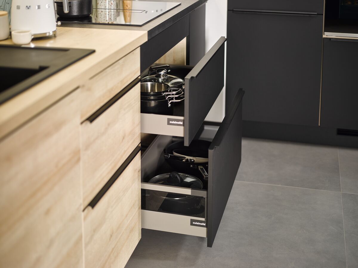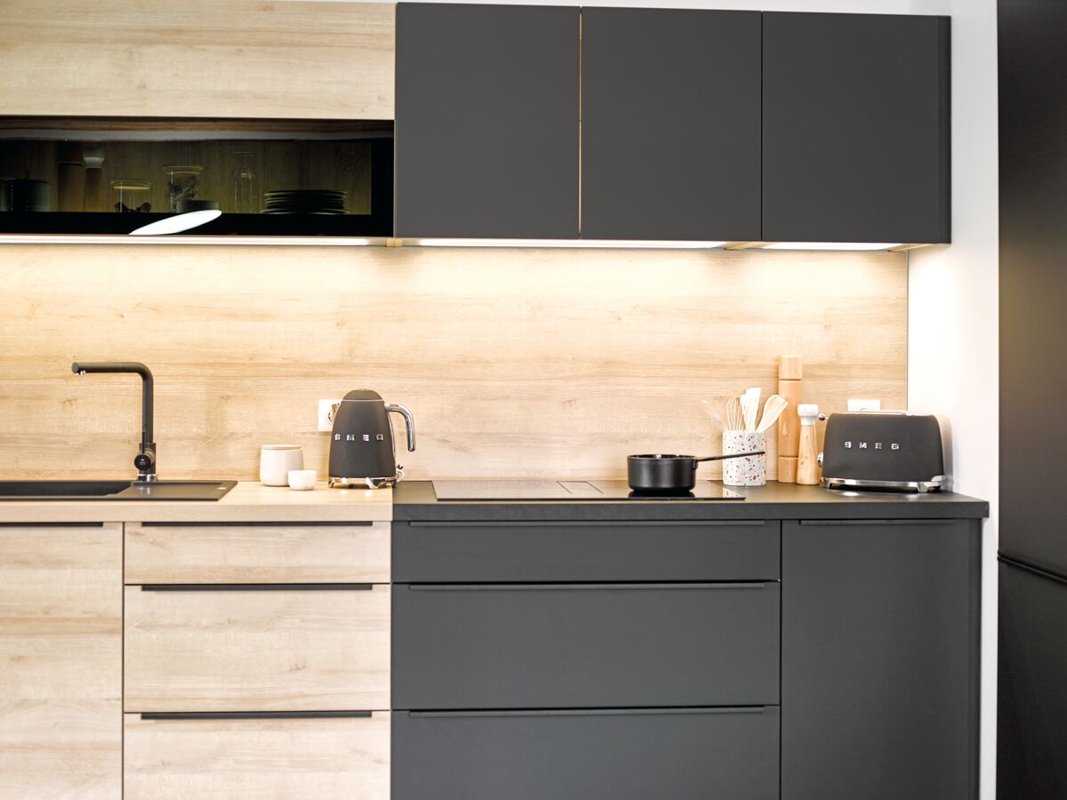 Cuisine équipée moderne TREND : la cuisine noire et bois clair