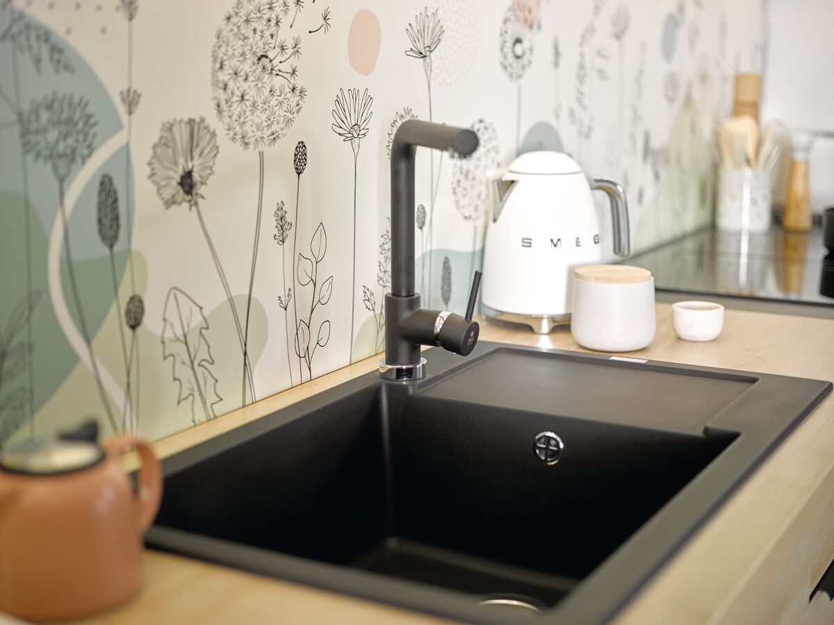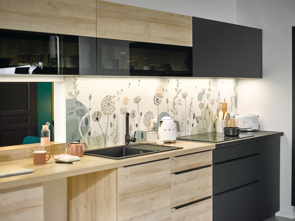 Si vos petits plats signent déjà le caractère unique de votre cuisine, ce modèle vous permet de traduire votre originalité à travers la déco de votre cuisine grâce à sa crédence Wild Nature, dont les motifs en impression numérique sont une exclusivité Cuisinella. Cette touche de nature est idéale pour apporter de la légèreté et une note d'esprit printanier à cette cuisine noire et bois, dont les grandes armoires sont dotées de tiroirs à l'anglaise. Entièrement équipée (réfrigérateur, four et micro-ondes), cette cuisine n'attend plus que votre créativité !