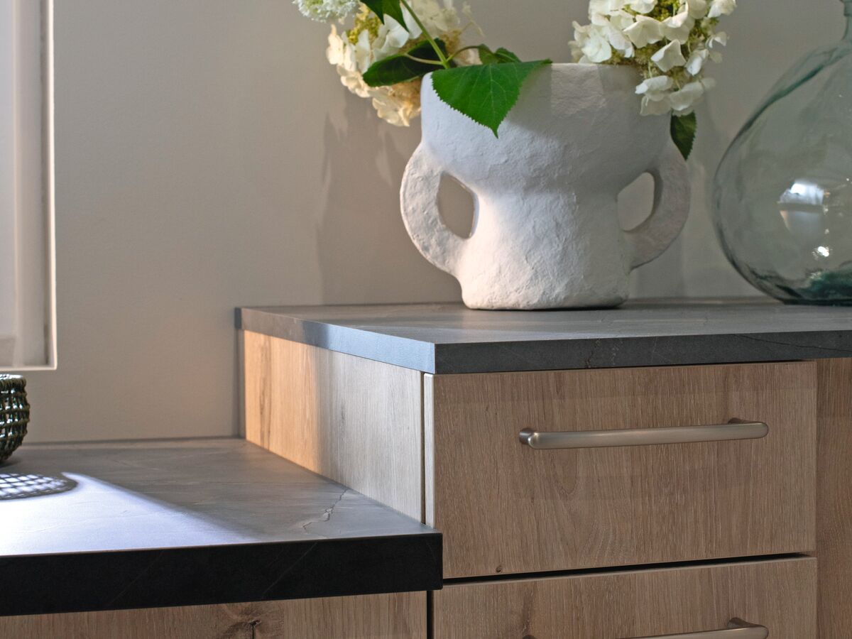Vous venez d’emménager à la campagne ? Vous avez toujours rêvé de vous mettre au vert ? La cuisine verte et bois Pure Nature vous accompagne dans vos envies de fraîcheur, d’authenticité et de délicatesse, mais aussi de praticité et de bien-être. En effet, elle offre un plan de travail de deux hauteurs différentes afin que vous profitiez du confort d’une cuisine ergonomique et de volume de rangement supplémentaire. Ce plan de travail à double niveau permet en effet de réaliser des tâches culinaires qui nécessitent des hauteurs différentes sans devoir courber le dos ou rehausser les épaules.