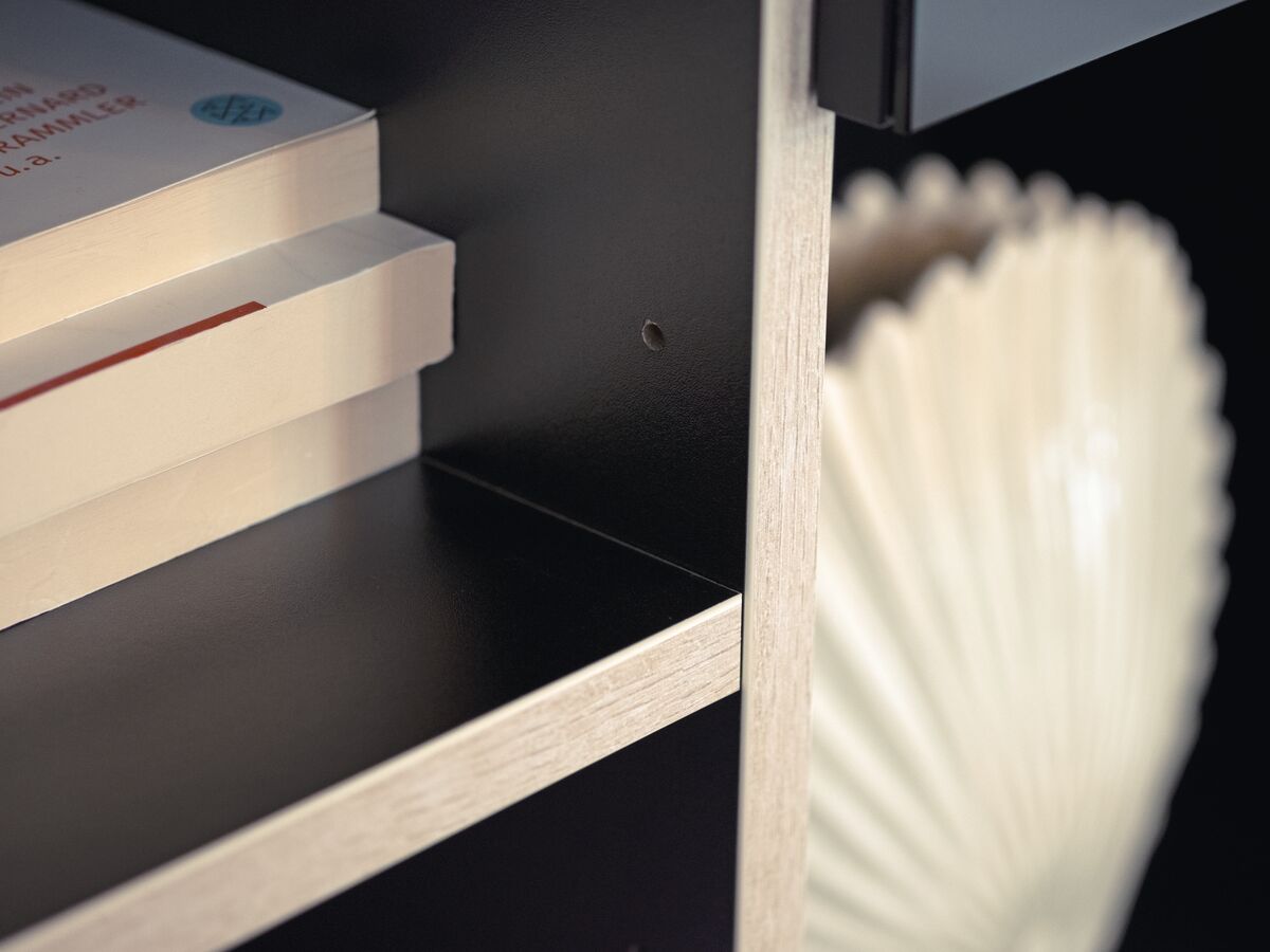 Multipliant les niches et les caissons en coloris Noir Pearl et Chants Darwin, cette bibliothèque murale originale, minutieusement adaptée aux dimensions de votre mur et à vos besoins, vous permet d'exposer vos livres et objets favoris, créant ainsi une déco intérieure à votre image. Cet écrin noir met vos objets en valeur et inscrit votre salon dans une atmosphère contemporaine par l'aspect régulier et ordonné des niches, que vous êtes libre de laisser ouvertes ou de fermer afin de jouer avec les impressions de volume.