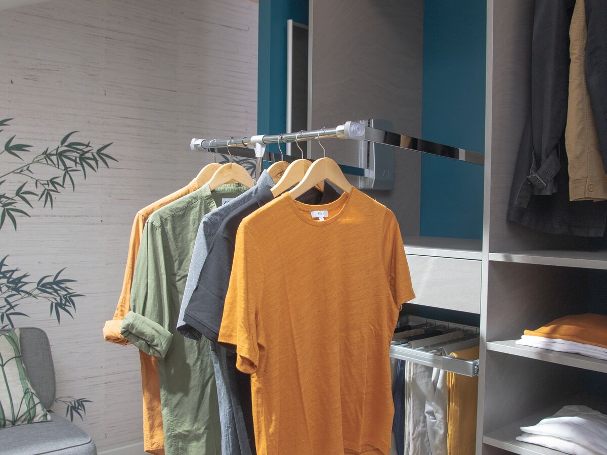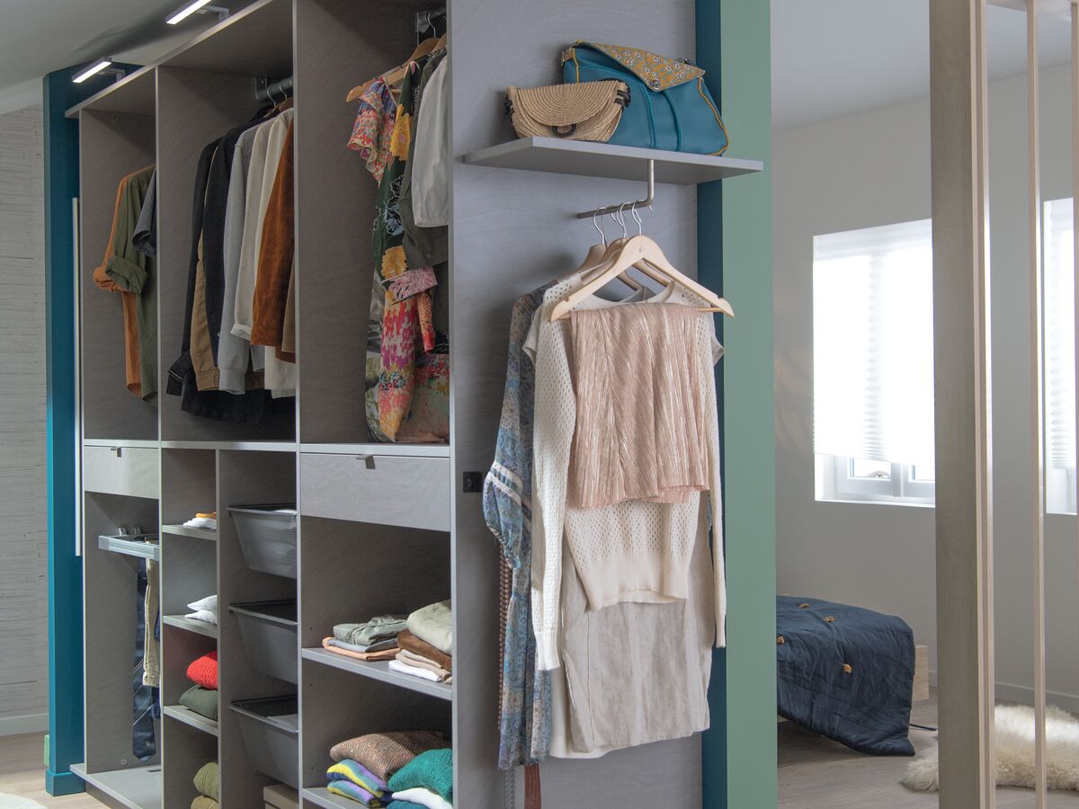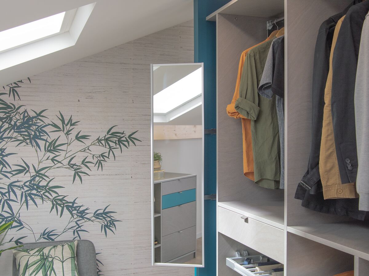 L’espace sous plafond est optimisé au maximum grâce à l’espace penderie, équipé de tringles basculantes pour une accessibilité facilitée. Un espace de rangement est dédié aux vêtements préparés le soir pour le lendemain.