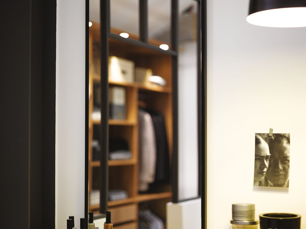 Un dressing et salle de bains avec baignoire sur pieds dans la même pièce chez vous ? Un rêve devenu réalité avec Cuisinella ! Pendant que votre bain coule, installez-vous dans le confortable fauteuil vintage et choisissez votre tenue dans le dressing TREND CUBE Chêne Honey, en scrutant vos habits à travers la verrière. Dans votre salle de bains, vous avez presque l’impression de faire les soldes : toute la mode stockée dans votre dressing, tous vos produits cosmétiques dans la salle de bains. Stockez-les dans les multiples organisateurs de tiroirs de vos deux grands tiroirs blocs, ou dans l’un des deux meubles à porte battantes. Une fois lookée et pouponnée : allez-vous admirer devant l’un des grands miroirs au contour fin, fixés au-dessus de chaque vasque. Rappel du bois présent dans le dressing, les meubles bas sont en bois Chêne Honey, dont l’aspect authentique est renforcé par les façades à cadre de la gamme Trend Cube. Mieux qu’un dressing et une salle de bains dans la même pièce ? Un dressing et une salle de bains indus dans la même pièce ! Le plan de toilette coloris Steel Drops rappelle le montant de la verrière. Le choix de la baignoire sur pieds et la lampe suspendue renforcent le look industriel de la pièce : le rêve.