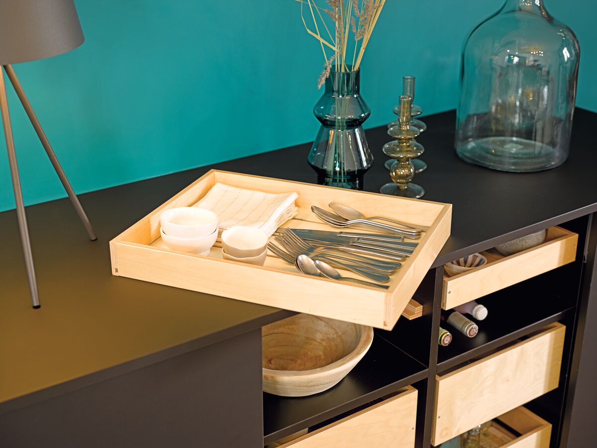 Deux portes Noir Pearl viennent compléter ce buffet noir mat. Elles soulignent le caractère moderne du meuble tout en laissant visible une partie du contenu de ce buffet bas design, d'aérer l'espace en laissant les clayettes apparentes. Cette version semi ouverte apporte une note de nature et de lumière au cœur du meuble. Les aménagements de Cuisinella sont tous sur mesures, ce qui vous permettra d'opter, si vous préférez, pour un total look noir, grâce à quatre façades noires, accentuant l'impression minimaliste de votre meuble.