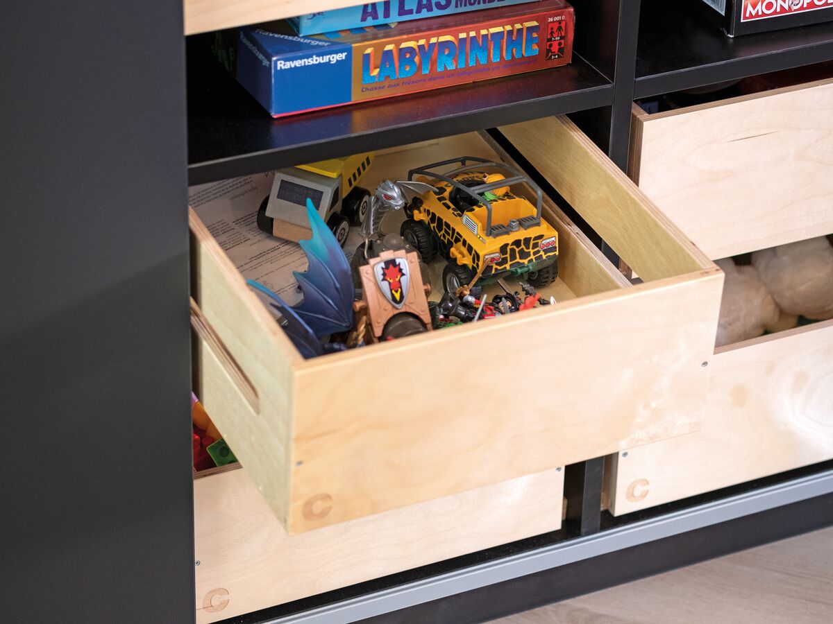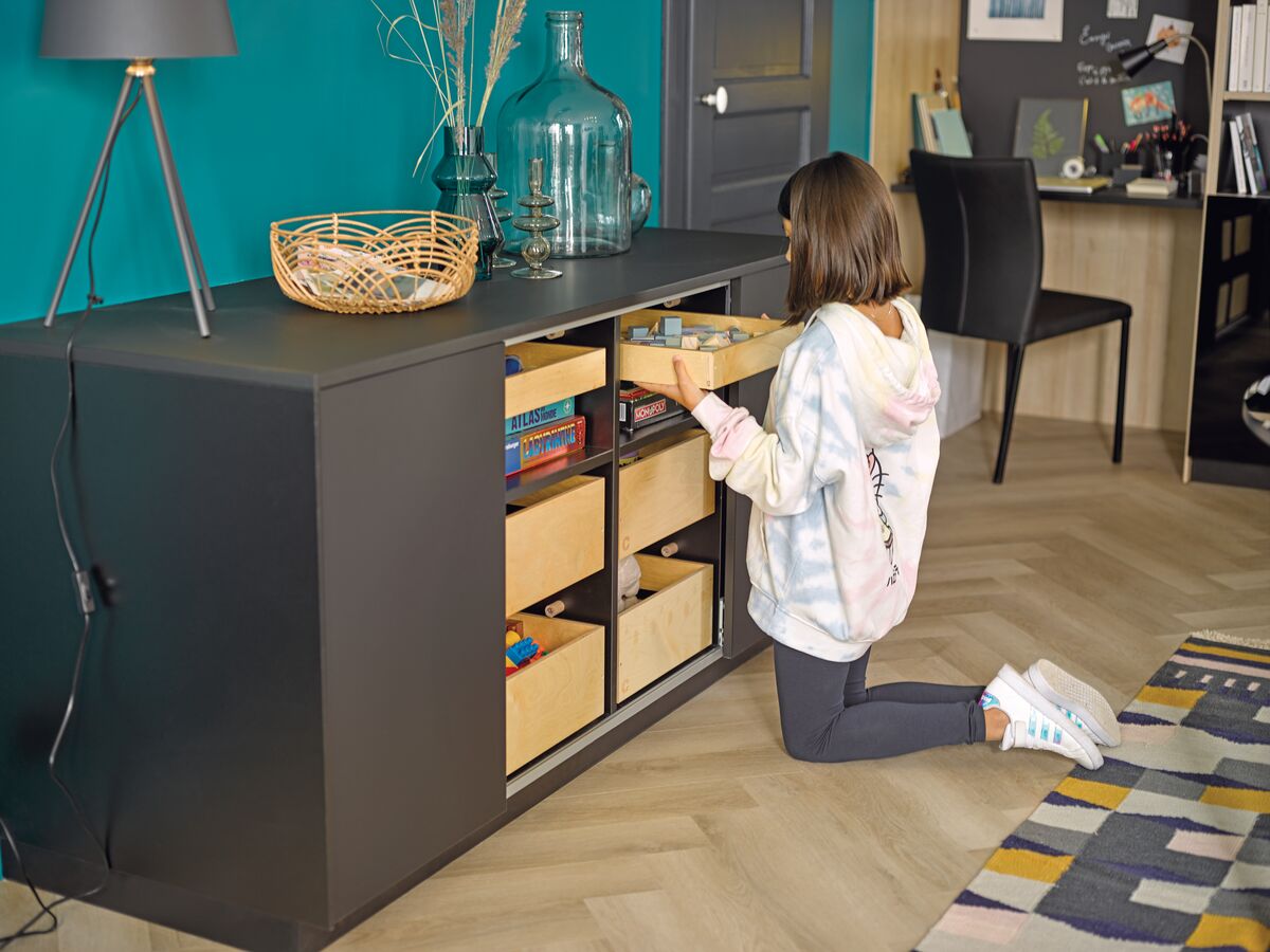 Placé dans le salon, le buffet Noir Pearl attire le regard par la sobriété de ses lignes et la modernité de ses coloris noir et bois. Associé au meuble bibliothèque Noir Pearl, il crée l'harmonie des couleurs et des formes dans votre pièce de vie, dans un esprit tendance et minimaliste. Conçu à partir de deux légumiers, ce buffet bas offre à votre salon l'originalité de ses clayettes en lieu et place des classiques tiroirs pour ranger couverts, jouets et autres objets du quotidien. Leur caractère amovible rend le rangement encore plus facile.
