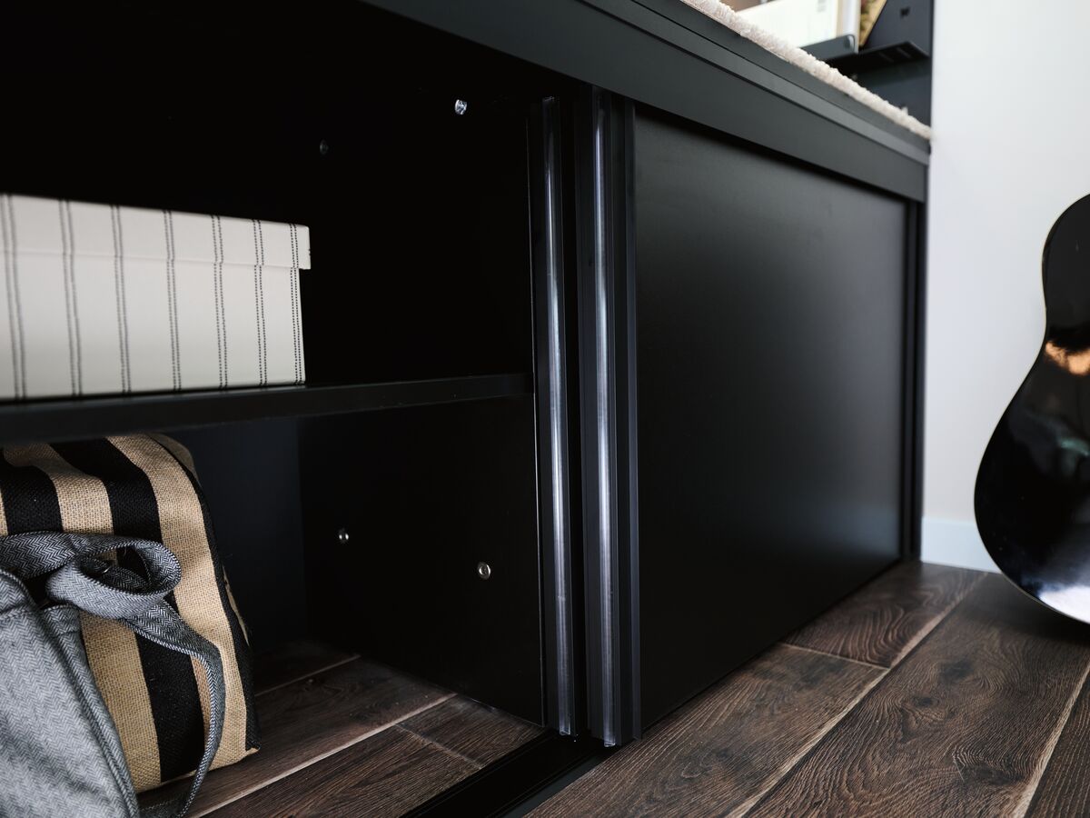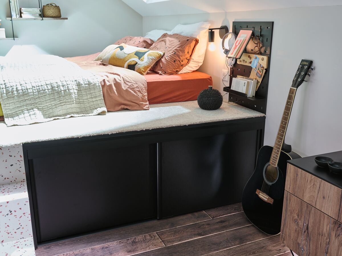 Côté style, ce placard intégré se pare d’un coloris noir idéal pour se fondre dans une ambiance indus et moderne. Minimaliste, il se fait discret tout en participant pleinement à la déco de la pièce. Sa sobriété permet de conserver un espace visuellement léger, un critère important dans les petits logements. Sa couleur unie n’en est pas moins un élément structurant de votre déco, pour travailler astucieusement les volumes au sein de votre studio, et délimiter efficacement votre coin nuit.