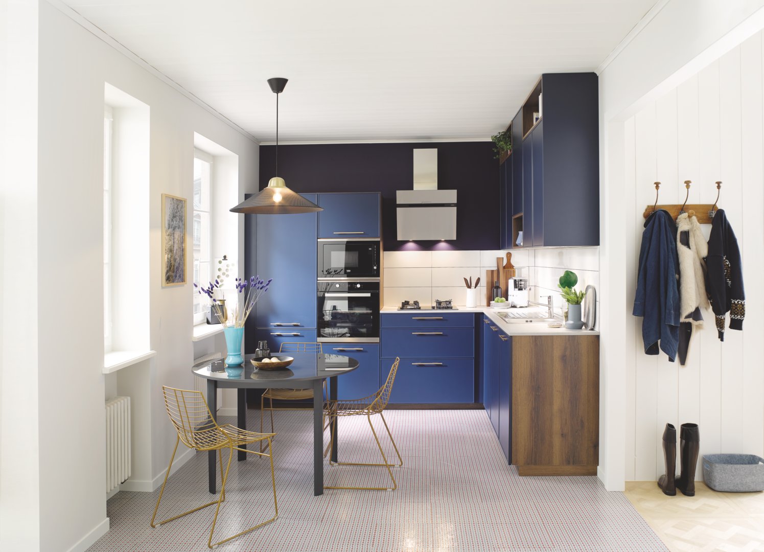 La première possibilité qui s’offre à vous est la cuisine en L. Dans ce cas, les meubles et équipements courent le long de 2 murs, formant ainsi un angle. Cet aménagement convient particulièrement aux petits espaces, où la table à manger peut prendre la forme d’un meuble pliant ou rétractable afin de gagner de la place. C’est l’idéal pour une cuisine modulable et compacte.