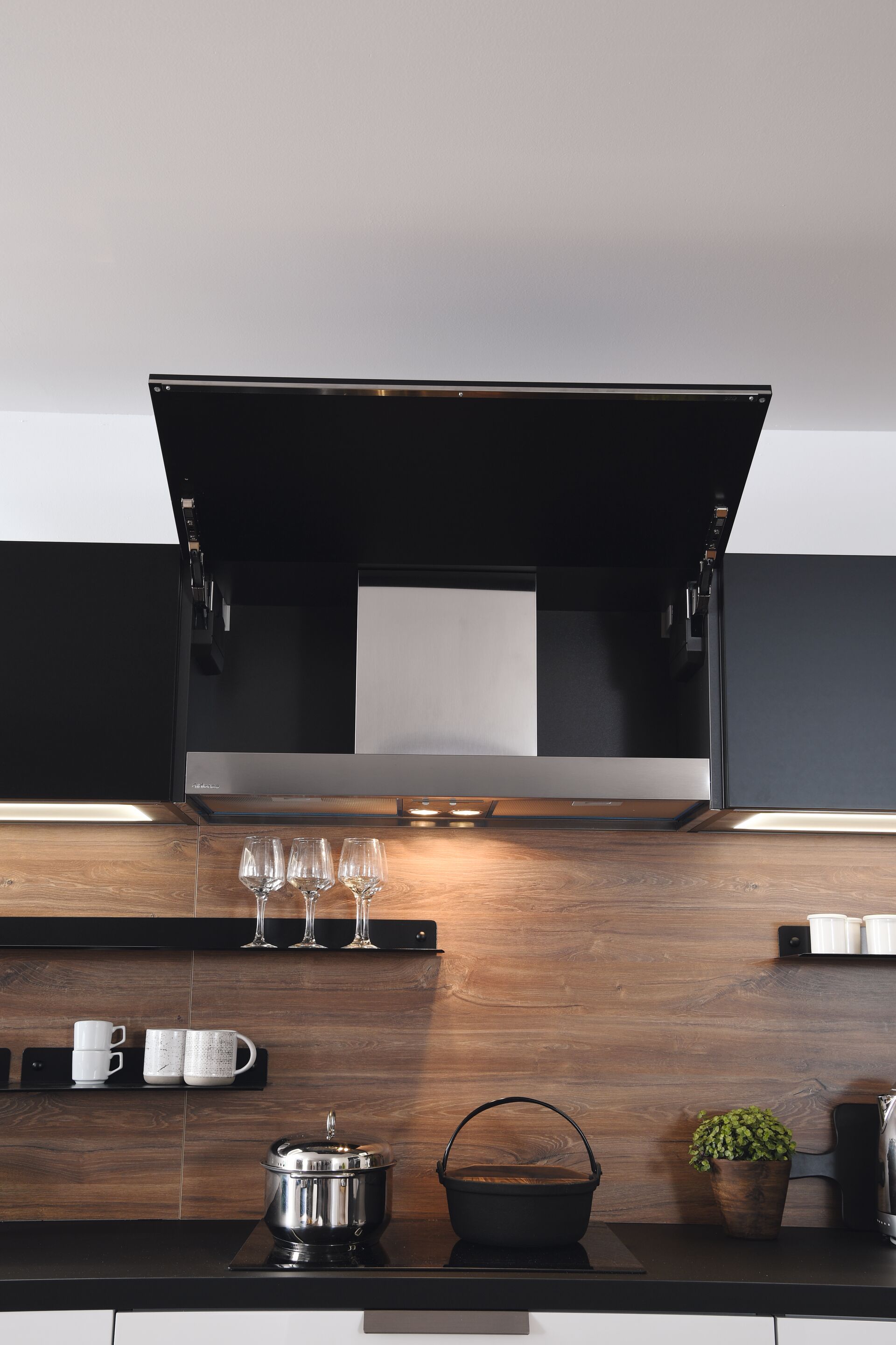 Un système d’aspiration tout aussi discret et astucieux consiste à installer une hotte aspirante classique, type hotte centrale, et à la cacher dans un meuble haut. Vous optimisez ainsi votre espace de rangement tout en profitant d’une hotte qui semble encastrée dans le meuble.