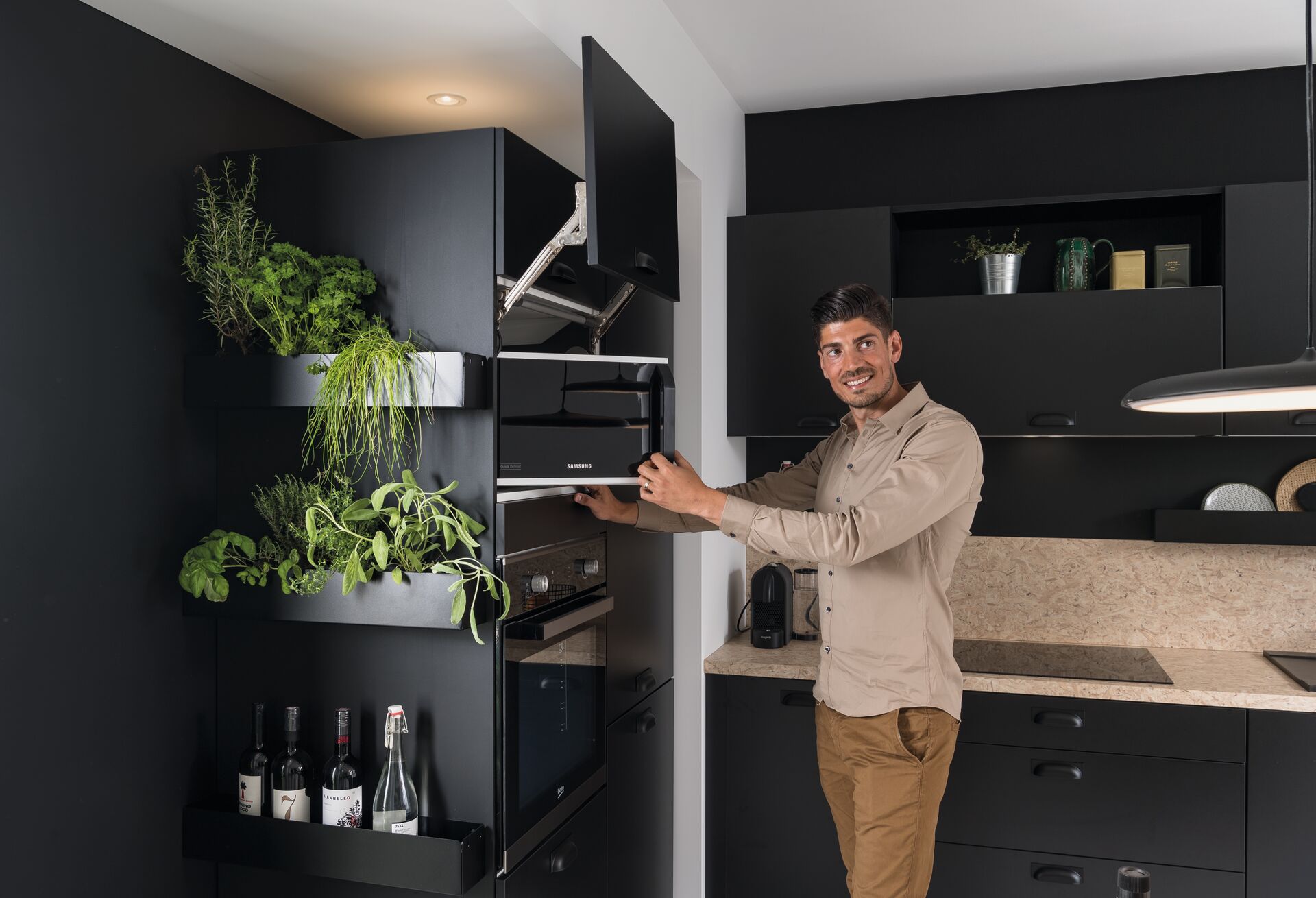 Si vous n’avez pas fait l’achat d’un micro-ondes combiné et que vous avez donc équipé votre cuisine d’un four, le must en matière d’aménagement de cuisine consiste alors à aligner parfaitement les deux appareils, qu’ils soient placés côte à côte ou l’un au-dessus de l’autre. Pour gagner un maximum de place tout en conservant l’esprit design de votre cuisine, il est également possible de placer le four sous le plan de travail et le micro-ondes dans la rangée des meubles hauts, à condition qu’il s’agisse d’un appareil classique.