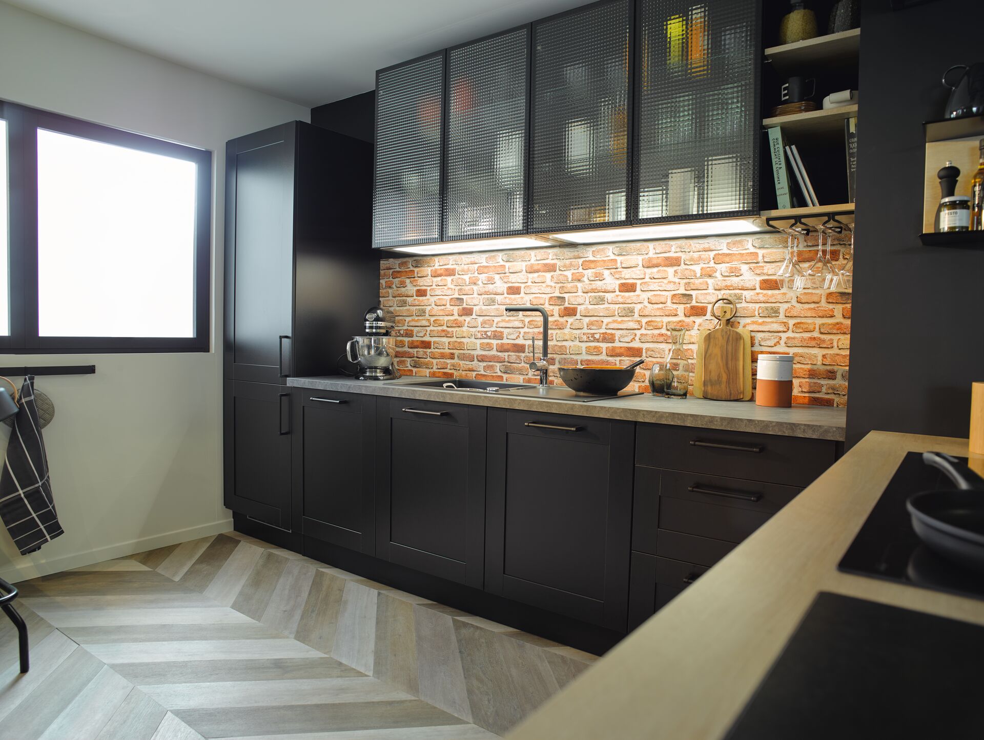 Dans ce style, tout est question de contraste, alors, on opte pour des couleurs sobres et foncées comme le gris, le noir et le marron, qui, associés aux matériaux bruts, donneront un coté chaleureux à votre cuisine industrielle ! Des briques aux murs (jetez donc un œil à la crédence Coron !), un effet béton en façade, des étagères métalliques : voilà les idées de base pour une cuisine type loft chic qui pourrait bien figurer dans le top 10 des cuisines style industriel de nos clients ! La combinaison de matières est la grande astuce pour marier modernité et esprit chaleureux dans une cuisine industrielle de caractère.