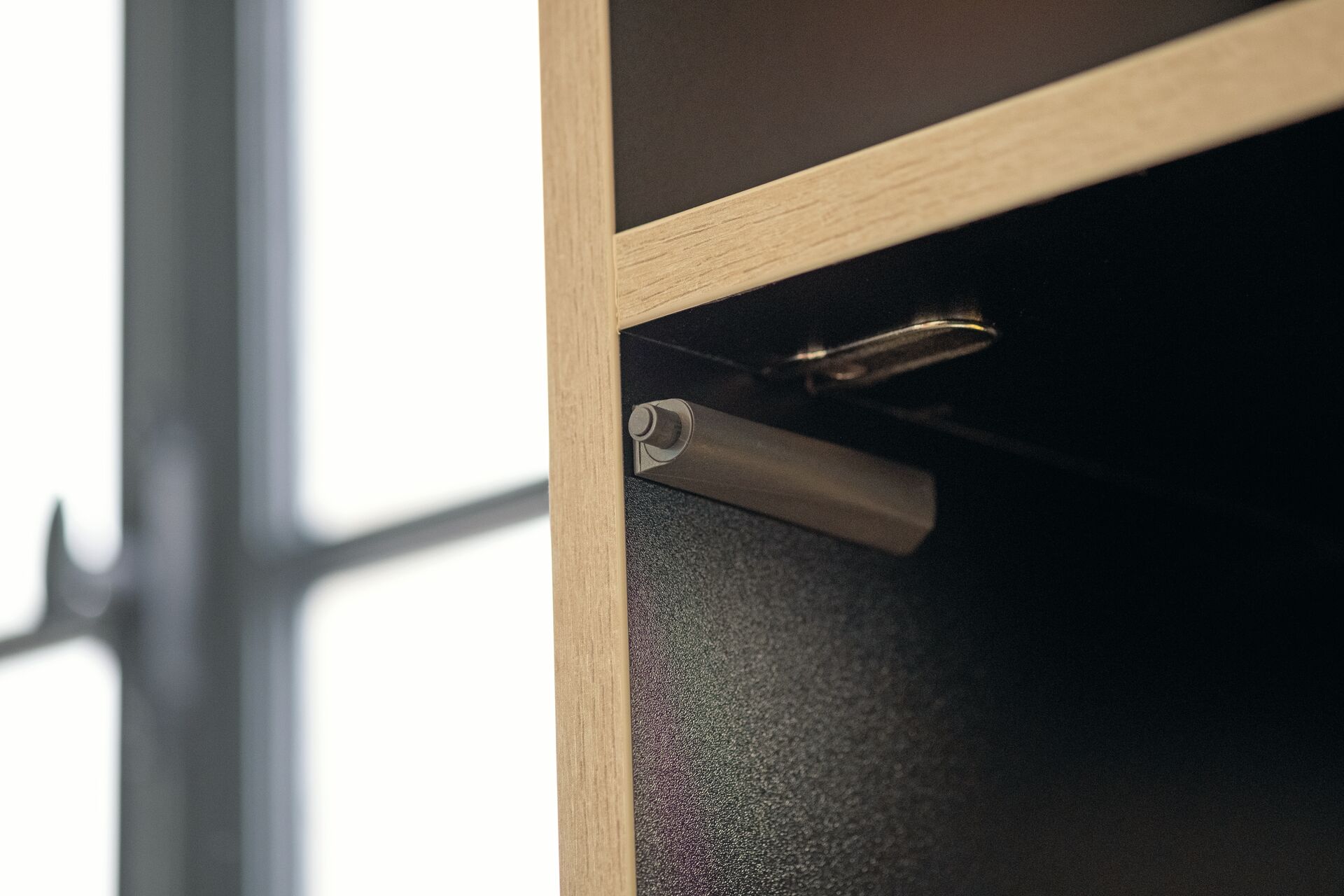 Autre possibilité pour une cuisine sans poignées : le système Touch Latch. L’ouverture du meuble se fait sur simple pression sur la façade, qui est ensuite maintenue ouverte par des vérins.