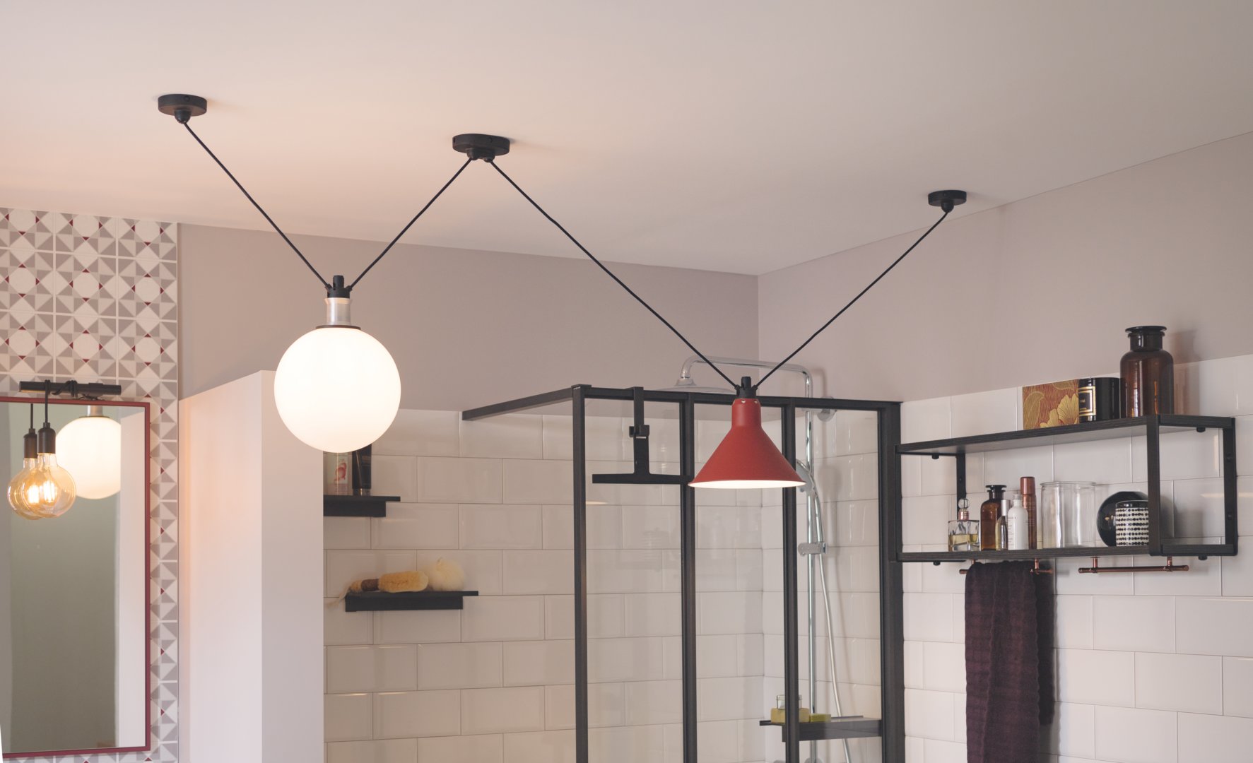 Le bac de douche et la baignoire, qui correspondent à la zone 1, peuvent également être éclairés par un système à très basse tension de sécurité. La valeur IP minimale nécessaire pour les luminaires de cette zone est de IPX4. C’est-à-dire qu’ils doivent résister aux projections d’eau.