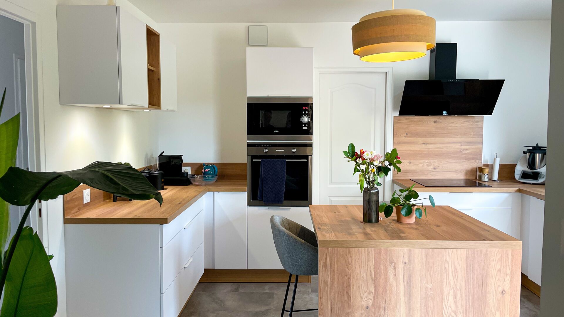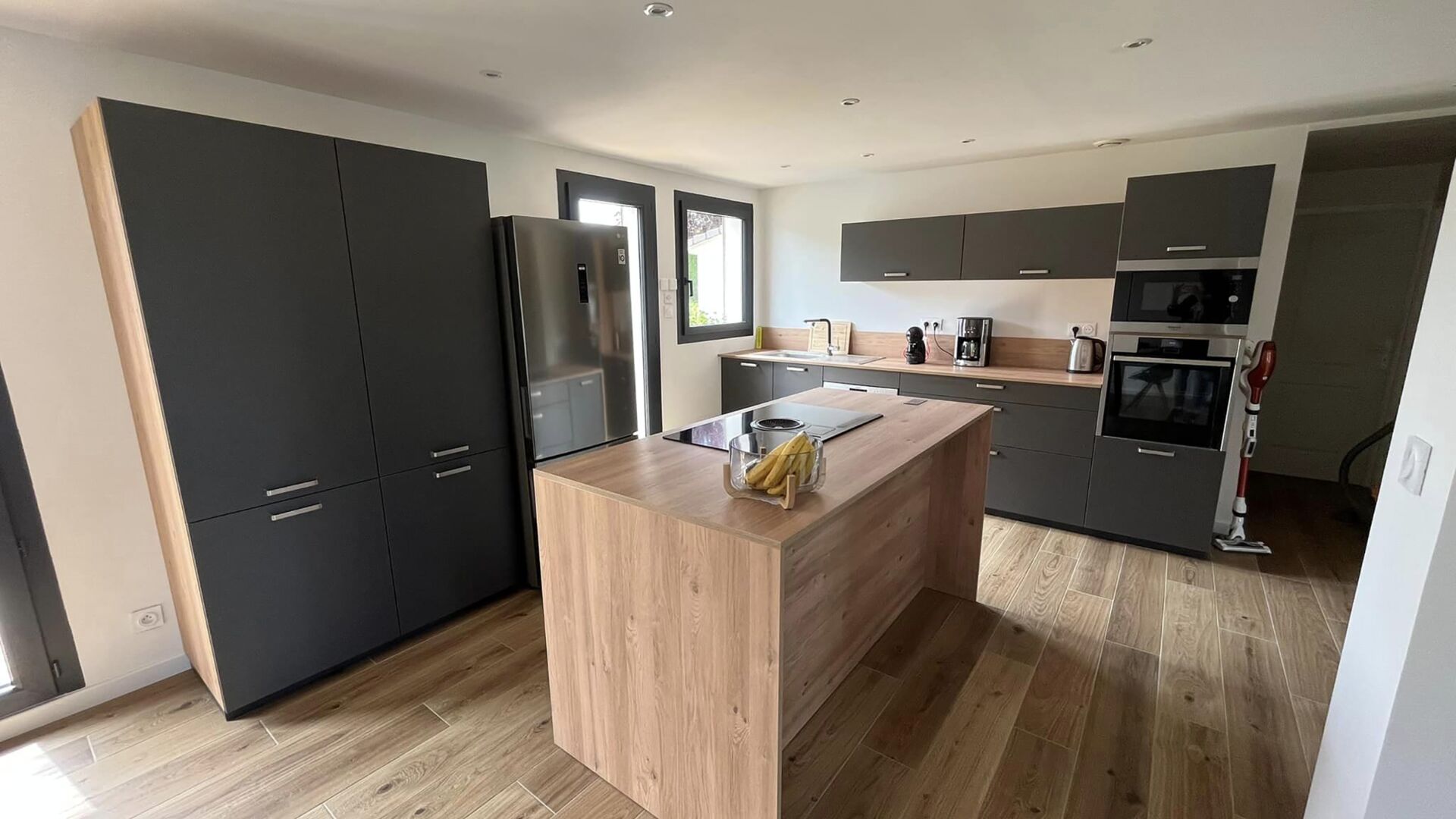 Les façades unies de cette cuisine mettent en valeur le bois de l’îlot central qui a été pensé comme un espace de préparation. Pour libérer du volume et faire profiter la pièce d’une atmosphère plus sobre et moderne, la plaque de cuisson installée sur l’îlot bénéficie des dernières évolutions technologiques en intégrant directement le système de hotte. Grâce aux nombreux rangements situés dans l’îlot, vous êtes assuré d’avoir l’essentiel sous la main pour réaliser vos repas au quotidien. En harmonie avec les encadrements des portes et fenêtres, les meubles offrent un aménagement complet avec électroménager intégré, à l’exception du réfrigérateur et du lave-vaisselle, dont les façades inox soulignent la modernité du style de cette cuisine.