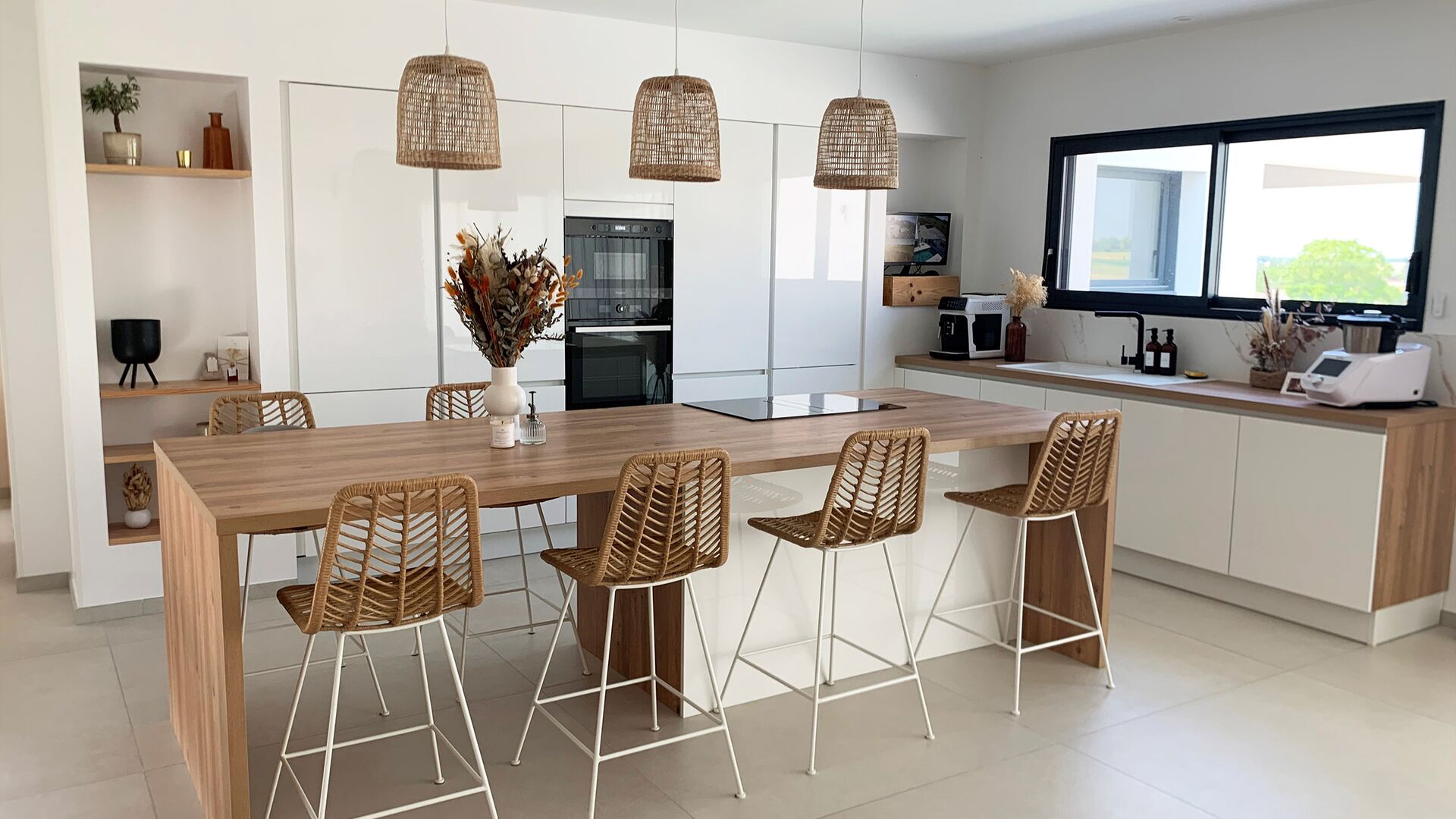 Espace dédié au repas, l’îlot central est ici également prévu pour réaliser la cuisson des plats, avec une plaque intégrée dans le plan de travail. Les façades blanc laqué reflètent la lumière qui pénètre par la grande fenêtre au-dessus de l’évier. Le choix de meubles sans poignées permet aux rangements de se fondre dans le mur, également blanc, afin d’offrir une pièce sobre aux accents modernes. Les matières naturelles des suspensions et des chaises hautes autour de l’îlot central s’accordent parfaitement avec la couleur claire du plan de travail en bois pour créer une atmosphère apaisante, bohème et nature.