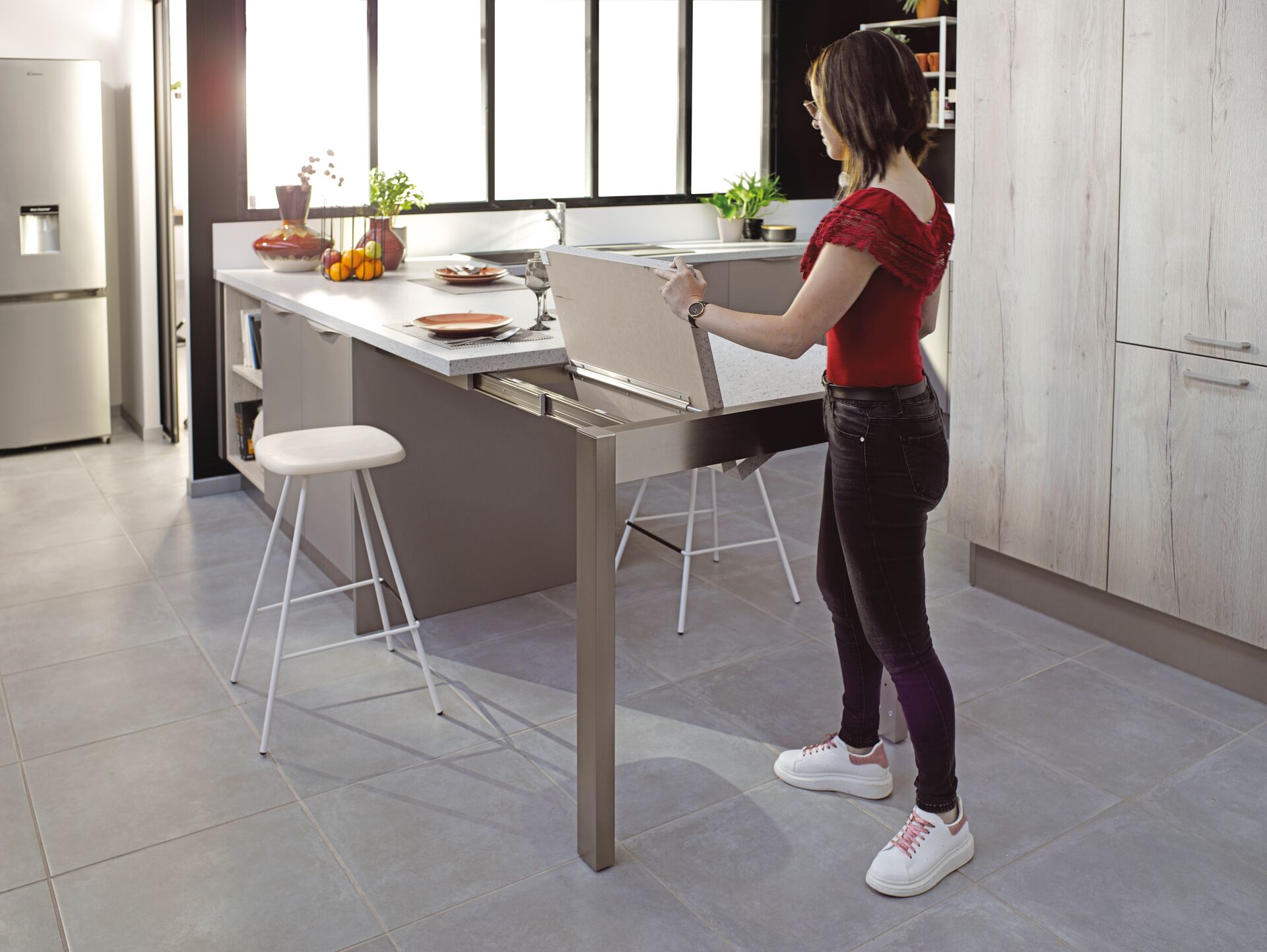 Grâce à un discret système, votre plan de travail peut également gagner en longueur, comme une table de repas à rallonge. C’est l’Escamo’table ! En un clin d’œil, vous pouvez ainsi accueillir deux assiettes supplémentaires, et retrouver un espace de circulation fluide dès le repas terminé.
