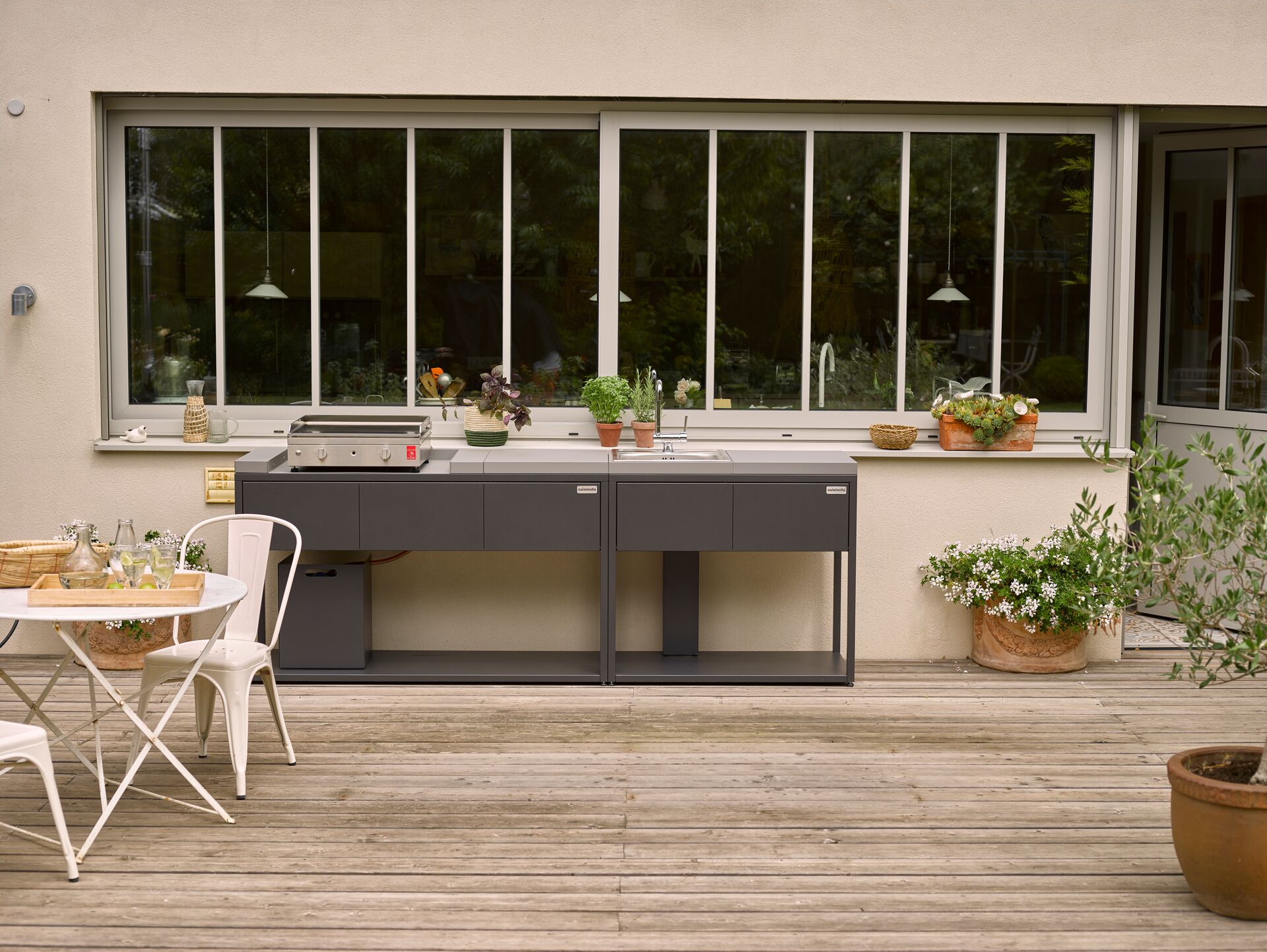 Ainsi équipée, votre cuisine d’extérieur n’appartiendra qu’à vous. Comme pour le garde-manger, vous pouvez ajouter des éléments à tout moment. Vous vous apercevez que vous manquez de place pour préparer ? Ajoutez le module du plan de travail. Vous vous rendez compte que pouvoir rincer les assiettes dehors serait plus pratique ? Ajoutez l’évier !