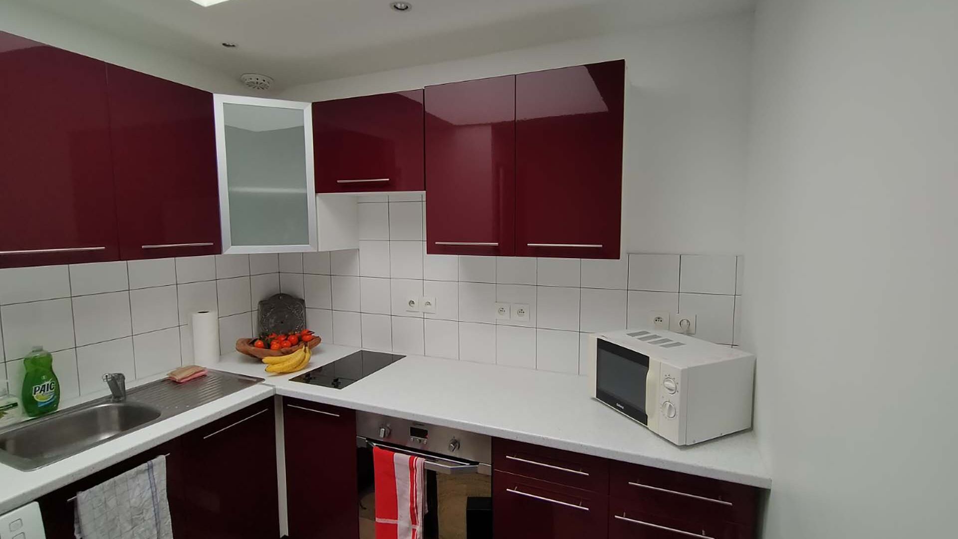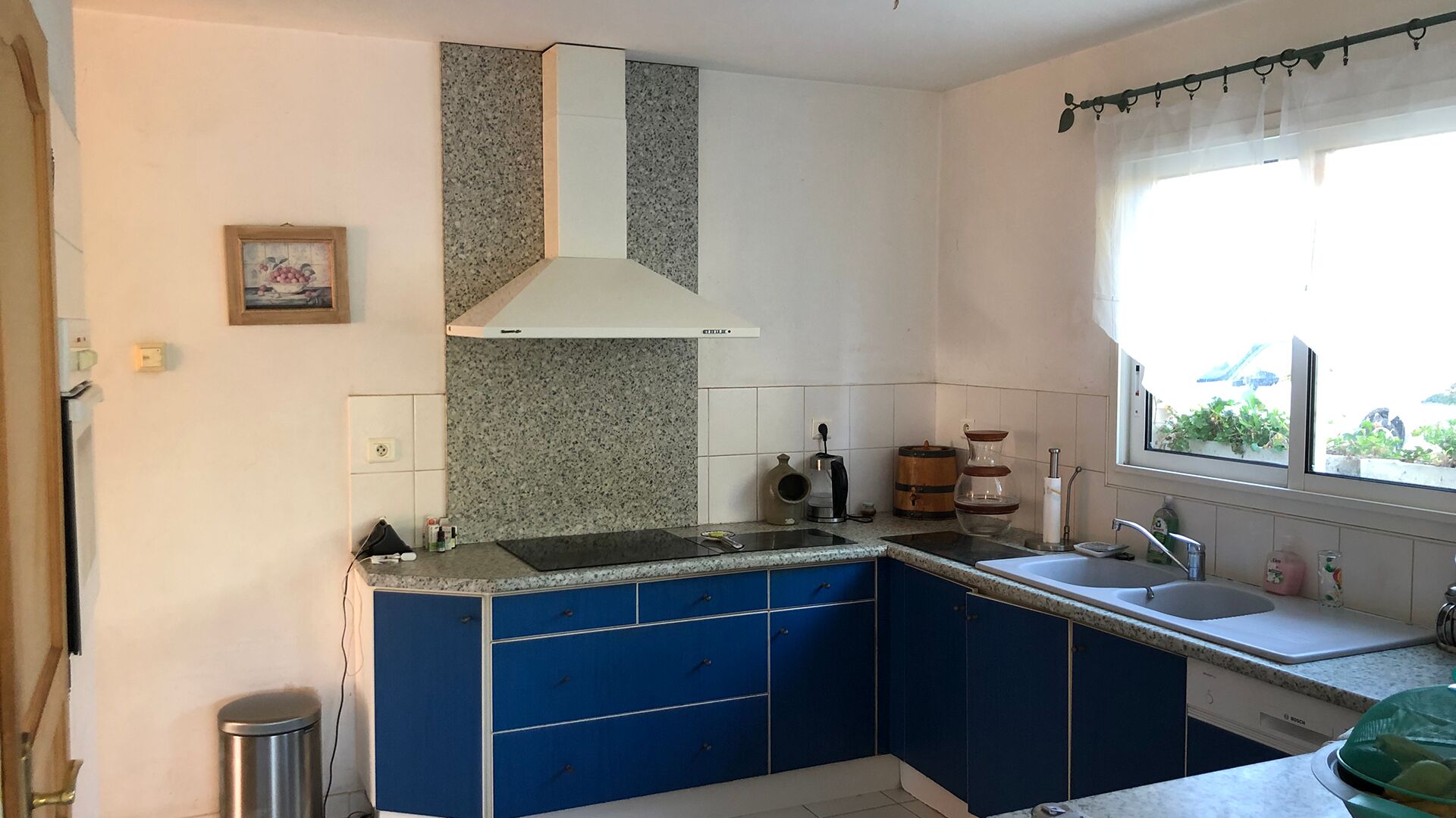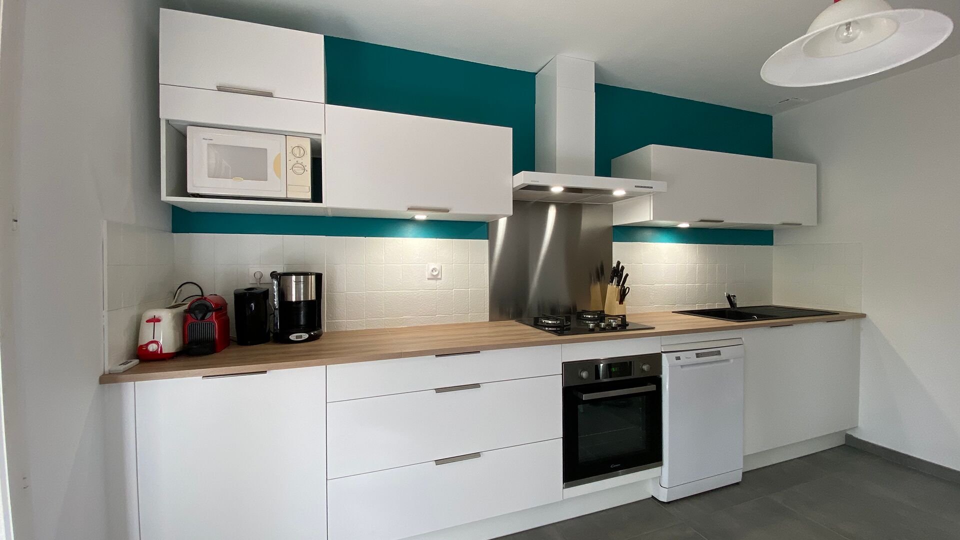 En faisant le choix de peindre la partie haute de son mur en bleu, ce client fait ressortir de manière éclatante la blancheur de ses meubles. La crédence également blanche ainsi que le plan de travail en bois clair ont été sélectionnés pour conserver la sensation de fraîcheur qui se dégage de l’association du blanc et du bleu. Un choix design tout indiqué pour une petite cuisine afin d’éviter une impression de pièce étriquée que les tons bruns de la cuisine originelle avaient tendance à créer. La fonctionnalité est également au rendez-vous avec des meubles hauts sur vérin, pour un maintien en position ouverte facilité et une fermeture en douceur.