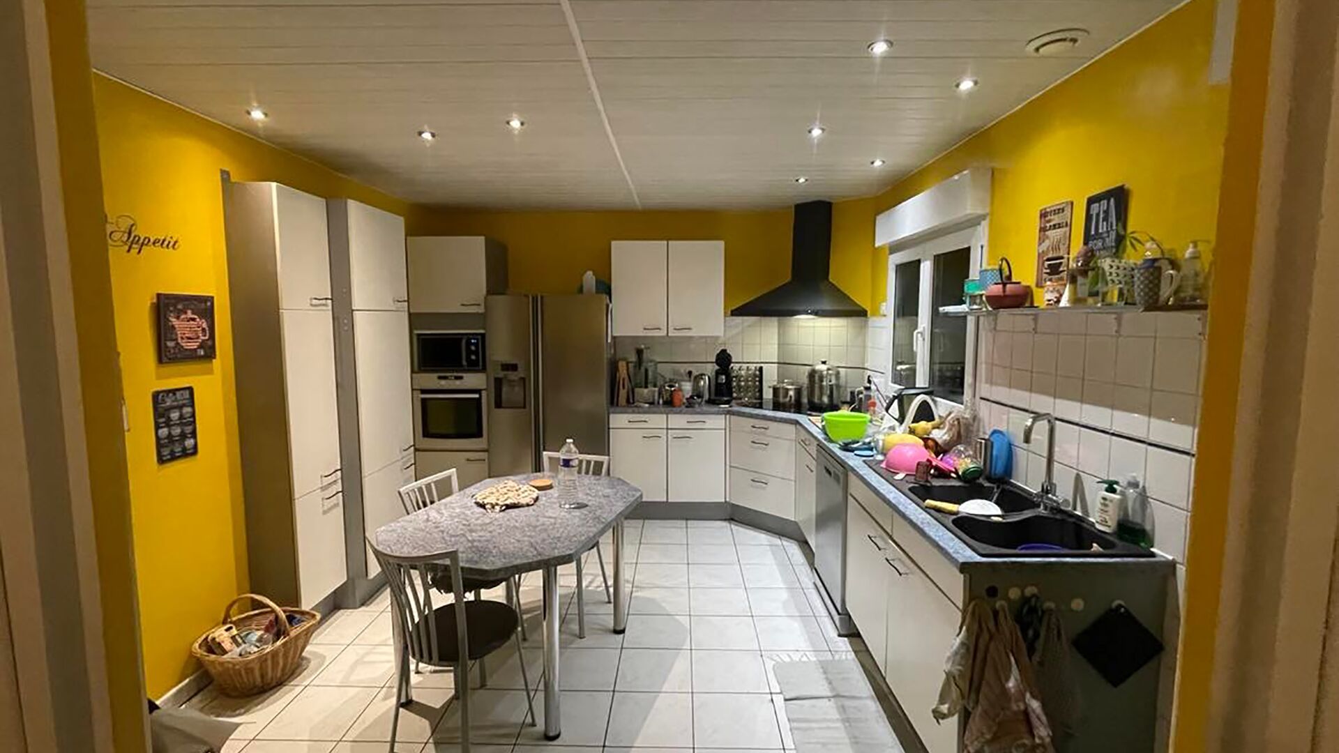 Conçue sur mesure, cette cuisine a fait table rase des meubles blancs et de la haute crédence aux carreaux carrés pour laisser place à des meubles et un équipement noirs aux lignes anguleuses modernes. En résulte un espace épuré et harmonieux, où les longues poignées dorées viennent souligner les lignes structurantes du projet tout en apportant une note chic à la pièce. Le design a été travaillé jusque dans les détails : le luminaire, la hotte, la plaque de cuisson... Tout s’intègre avec une discrétion toute contemporaine à l’esprit d’ensemble. Après travaux, la cuisine bénéficie d’une véritable seconde vie et devient l’une des pièces les plus modernes de la maison.