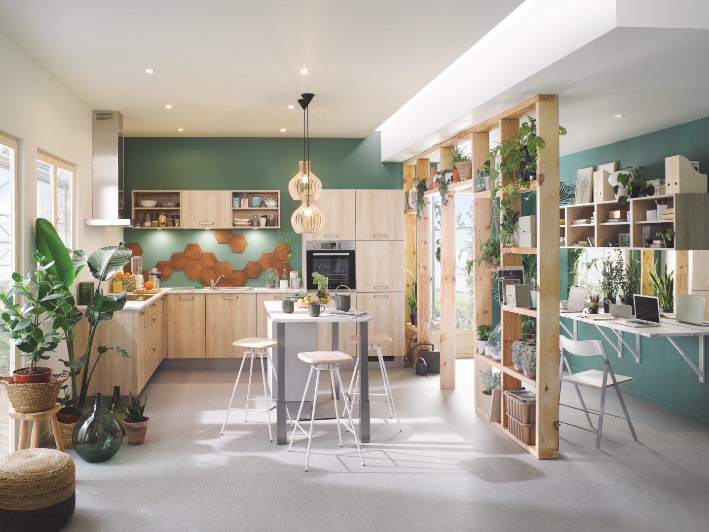 Toujours très minimaliste, le style scandinave fait sensation dans les cuisines contemporaines. Mêlant matériaux naturels avec couleurs apaisantes, il définit les espaces avec douceur. Laissez-vous tenter par un îlot central avec un revêtement bois clair, comme les façades des placards. On aime aussi les étagères en bois brut, ornées de pot de fleurs qui apportent un regain de vitalité dans la salle.