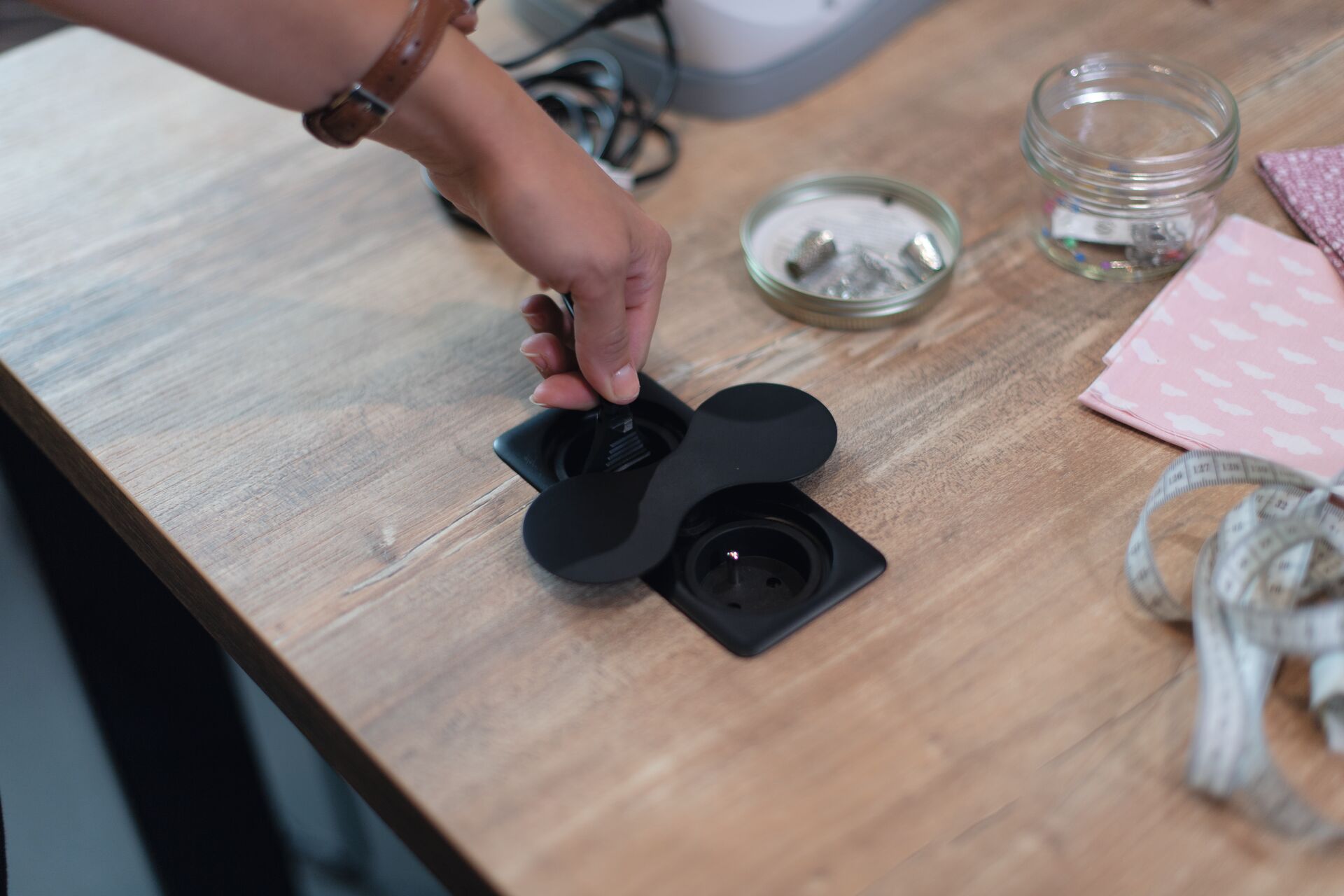 Cuisinella vous propose une astuce très pratique pour gagner de la place tout en ayant des prises électriques à votre disposition. Optez pour des prises intégrées dans le plan de travail, que vous pourrez clore lorsqu’elles ne sont pas utilisées. Non seulement cela évite les rallonges et les fils électriques qui traversent la pièce (au risque de se prendre les pieds dedans), mais en plus, c’est une solution très esthétique et design ! L’idéal est de faire installer au moins deux prises : une pour la machine à coudre et une pour l’éclairage au-dessus du bureau.