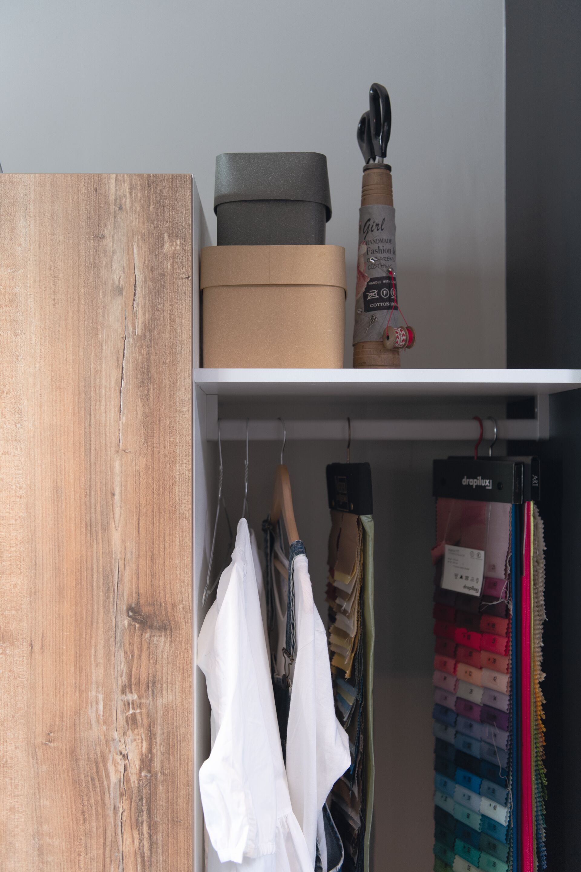 Vous êtes fier de vos œuvres ? Il y a de quoi ! Et si vous les stockiez sur des tringles ? Non seulement vous pourrez les admirer en permanence, mais en plus elles ne se froisseront pas ! Les tringles vous seront aussi très utiles pour accrocher les vêtements que vous êtes en train de réaliser. Vous pouvez opter pour un petit placard sur mesure, qui s’imbriquera parfaitement dans le fond de votre atelier. Si vous avez assez de place, pourquoi pas un dressing en L ? Votre atelier semblera tout droit sorti d’un magazine de déco.