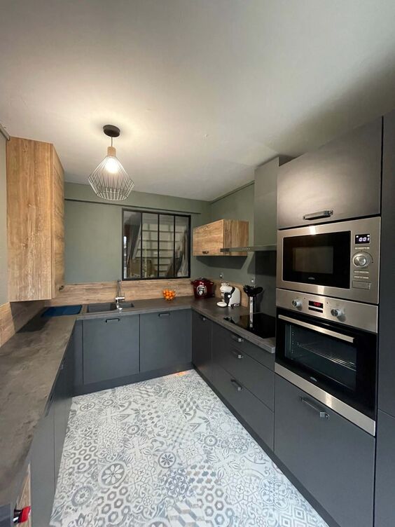 Pour avoir une cuisine 100 % contemporaine, place au gris anthracite ! En l’associant à un vert pomme ou un vert bouteille, il apportera un look ultra-moderne à votre coin cuisine. Une peinture gris foncé sur un des murs, un joli vert pomme délicat sur un autre pan, le tout en contraste avec un plafond et un sol blancs, apporteront dynamisme et modernité. Pour les adeptes des cuisines design et techno !