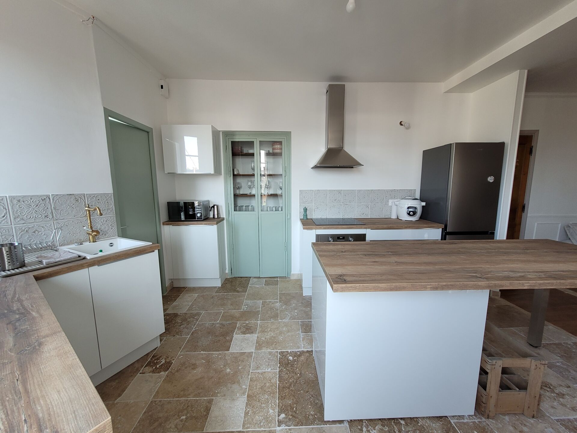 Nature et minéralité dans une cuisine blanche avec des notes de vert