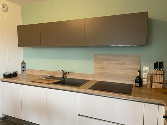 Avoir des meubles blancs peut aussi être l’occasion de mettre en œuvre une déco orientée nature. Pour cela, vous pouvez vous inspirer de la tendance scandinave, où le blanc occupe une place de choix, afin de créer une atmosphère lumineuse, légère et où l’on a l’impression de respirer librement. Ce côté rafraîchissant du blanc peut être souligné par l’association de la couleur verte, de préférence claire : vert anis, vert pomme, vert kaki… Bien des nuances confèreront à votre cuisine une atmosphère printanière. Le vert figure d’ailleurs en bonne place dans le top 10 des cuisines blanches de nos clients, appliqué en peinture sur les murs.