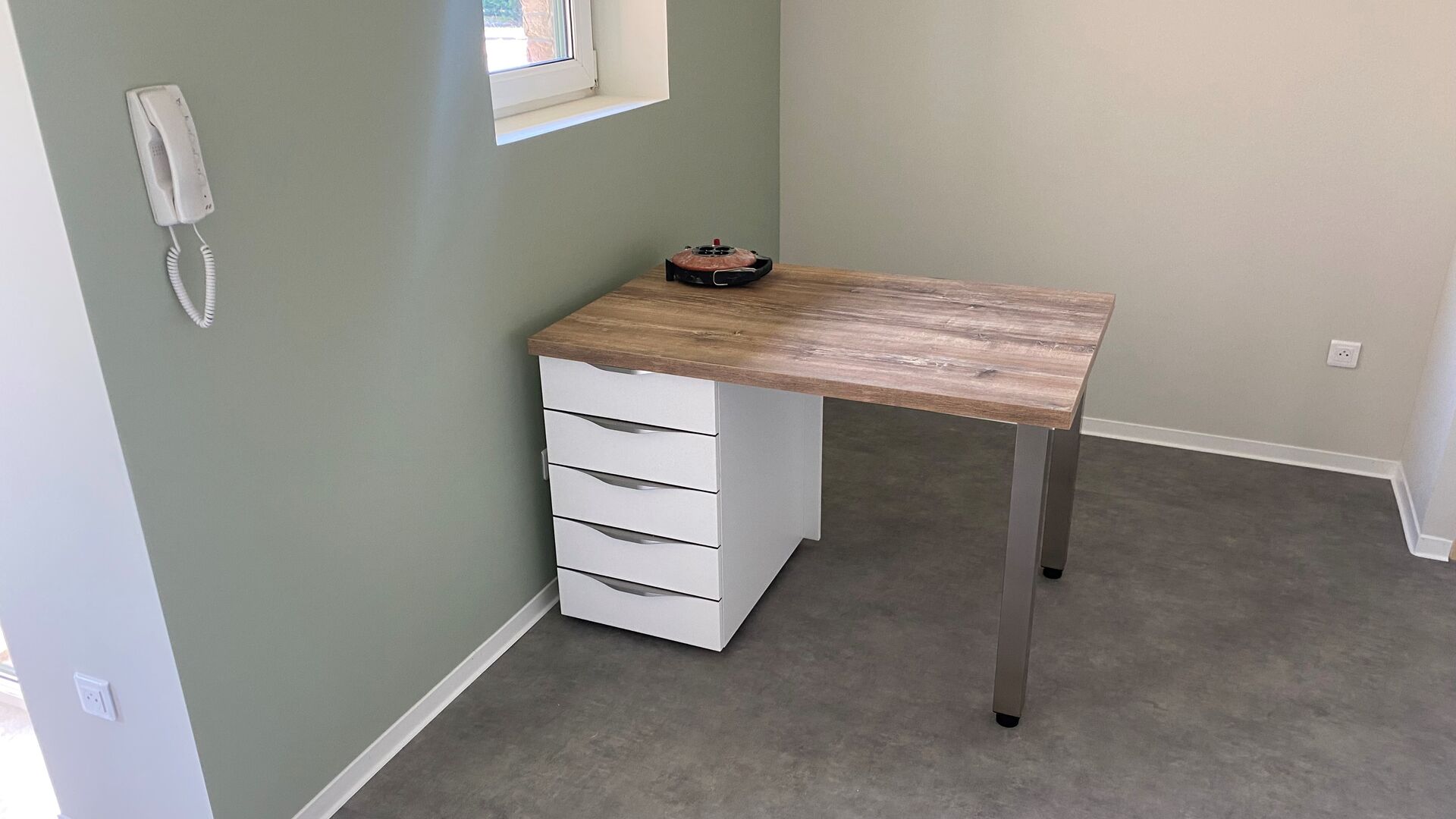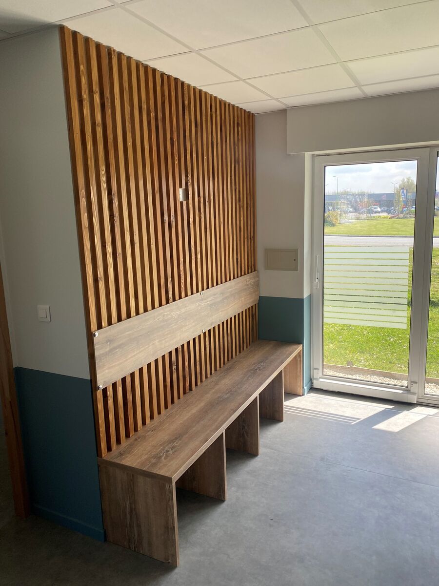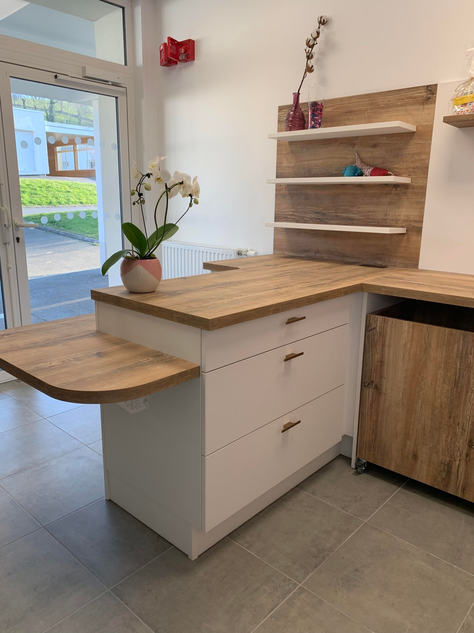 L’association du bois et du blanc est un classique design qui s’apprécie autant à la maison qu’en entreprise ! Dans cette blanchisserie, le plan de travail en angle, avec sa reprise décalée quelques centimètres en dessous, assure unespace d’accueil particulièrement fonctionnel. Dans la même optique, les grands bacs destinés à recevoir le linge sont montés sur roulettes afin de pouvoir être manipulés facilement. Les étagères aux murs maintiennent un espace ouvert et aéré tout en offrant des rangements aisément accessibles. Un aménagement tout en sobriété, qui a choisi de faire preuve de modernité, et où l’aspect pratique est resté une priorité ! Le lieu de travail doit être un espace aussi agréable à vivre que la maison pour ceux qui y exercent leur activité professionnelle comme pour les visiteurs. C’est chose faite avec ce meuble d’accueil aux rangements personnalisés !
