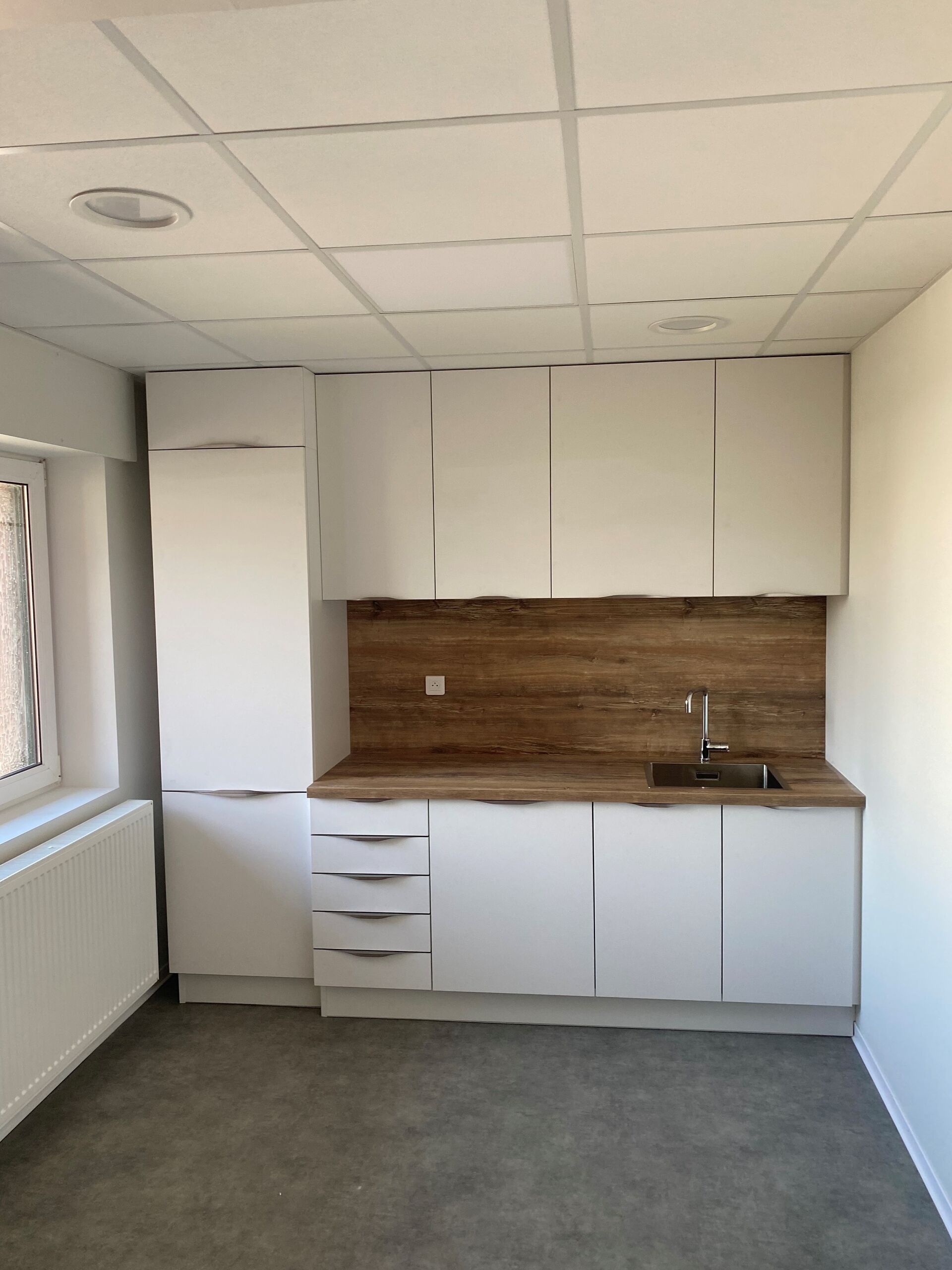 Vous avez besoin de ranger, ranger et ranger encore ? Avec un aménagement tout en longueur, vous multipliez les possibilités : placard, tiroirs, armoire... Grâce à une conception sur mesure, n’hésitez pas à poser des rangements jusqu’au plafond : le jeu des profondeurs et la couleur blanche lumineuse permettent de limiter l’impression d’encombrement. L’ajout d’un point d’eau a ici été pensé avec une hauteur de crédence adaptée à un environnement professionnel exigeant en terme d’hygiène.