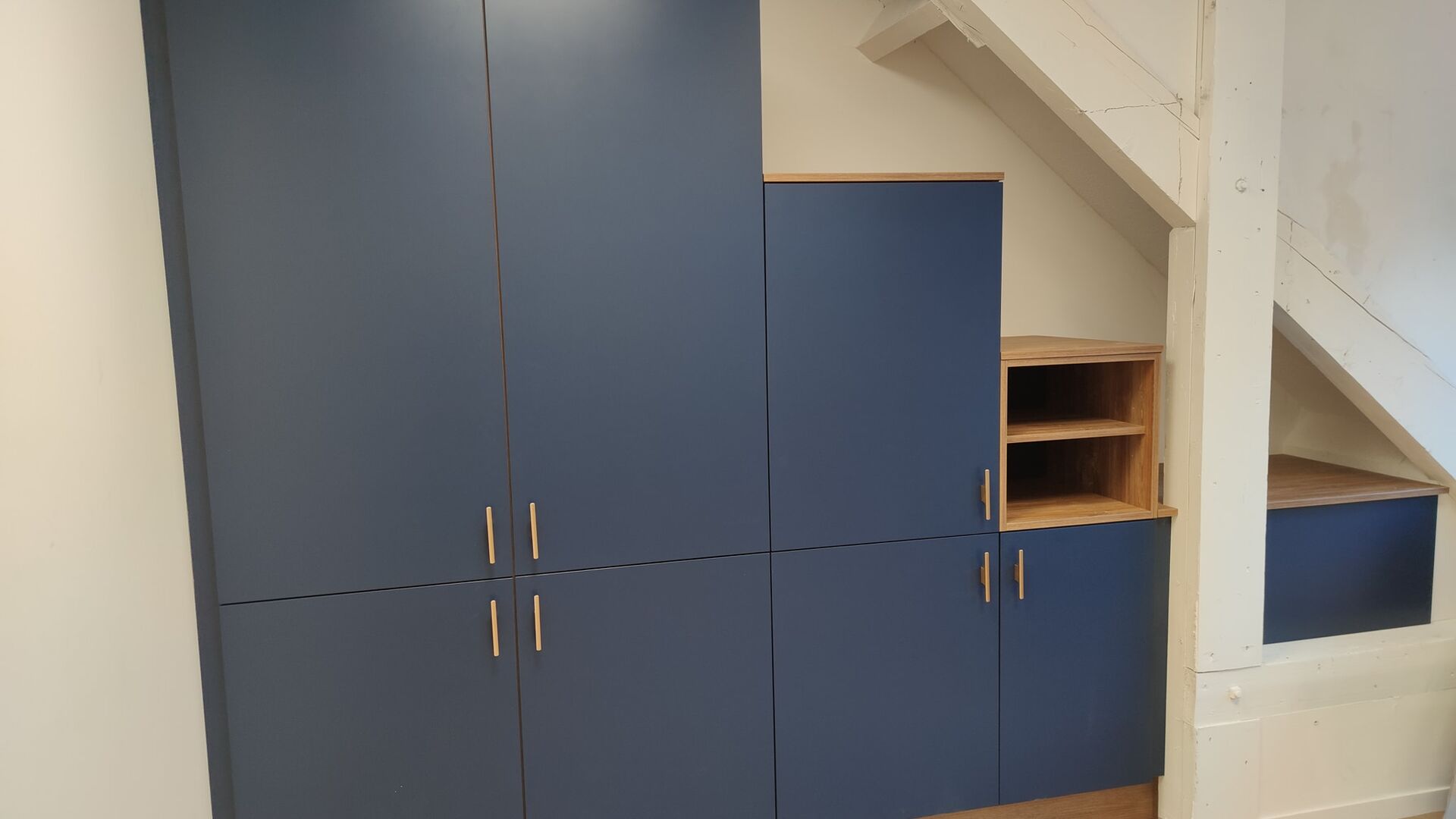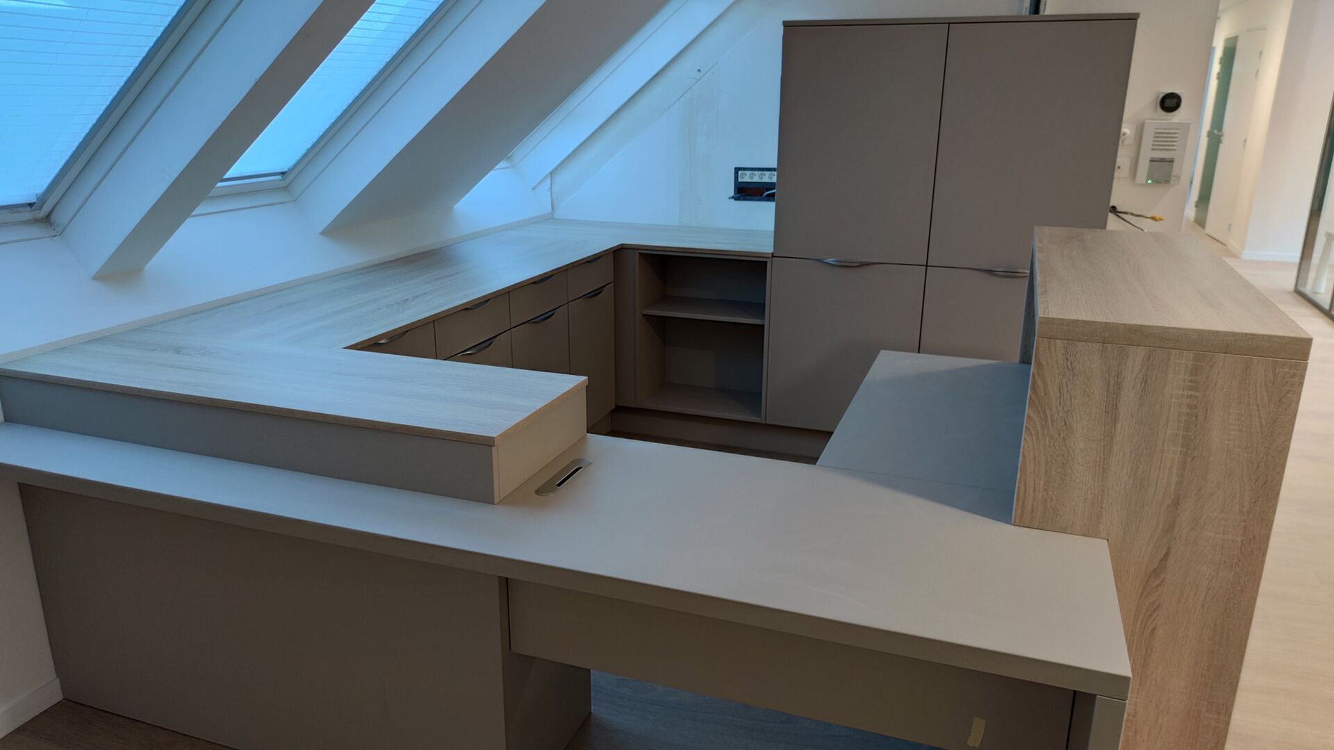 Aménager un espace professionnel, c’est tenir compte de toutes ses contraintes. Pour les grands espaces comme pour une pièce sous les toits ou un recoin sous les escaliers, Cuisinella a une solution pour optimiser votre pièce et vous permettre d’exercer votre activité professionnelle : un plan de travail à plusieurs niveaux, des placards aux dimensions adaptées, et surtout un design qui pense aux petits espaces. Mettez de la couleur dans votre espace professionnel, et pensez son aménagement pratique comme une véritable décoration ! C’est bien ce qu’a décidé ce cabinet médical en ajoutant une façade corail à sa petite cuisine entre ses électroménagers ou du bleu sous les escaliers. Sous les fenêtres de toit, c’est le jeu des reliefs qui confère à l’aménagement son dynamisme unique.